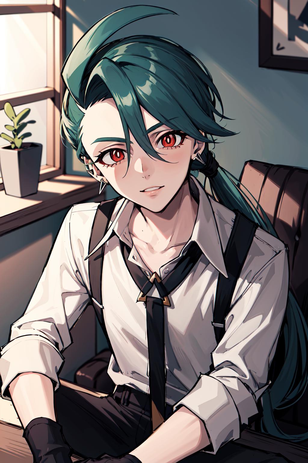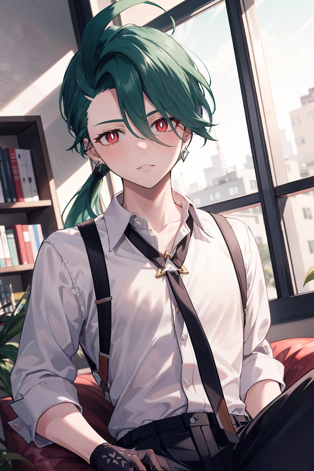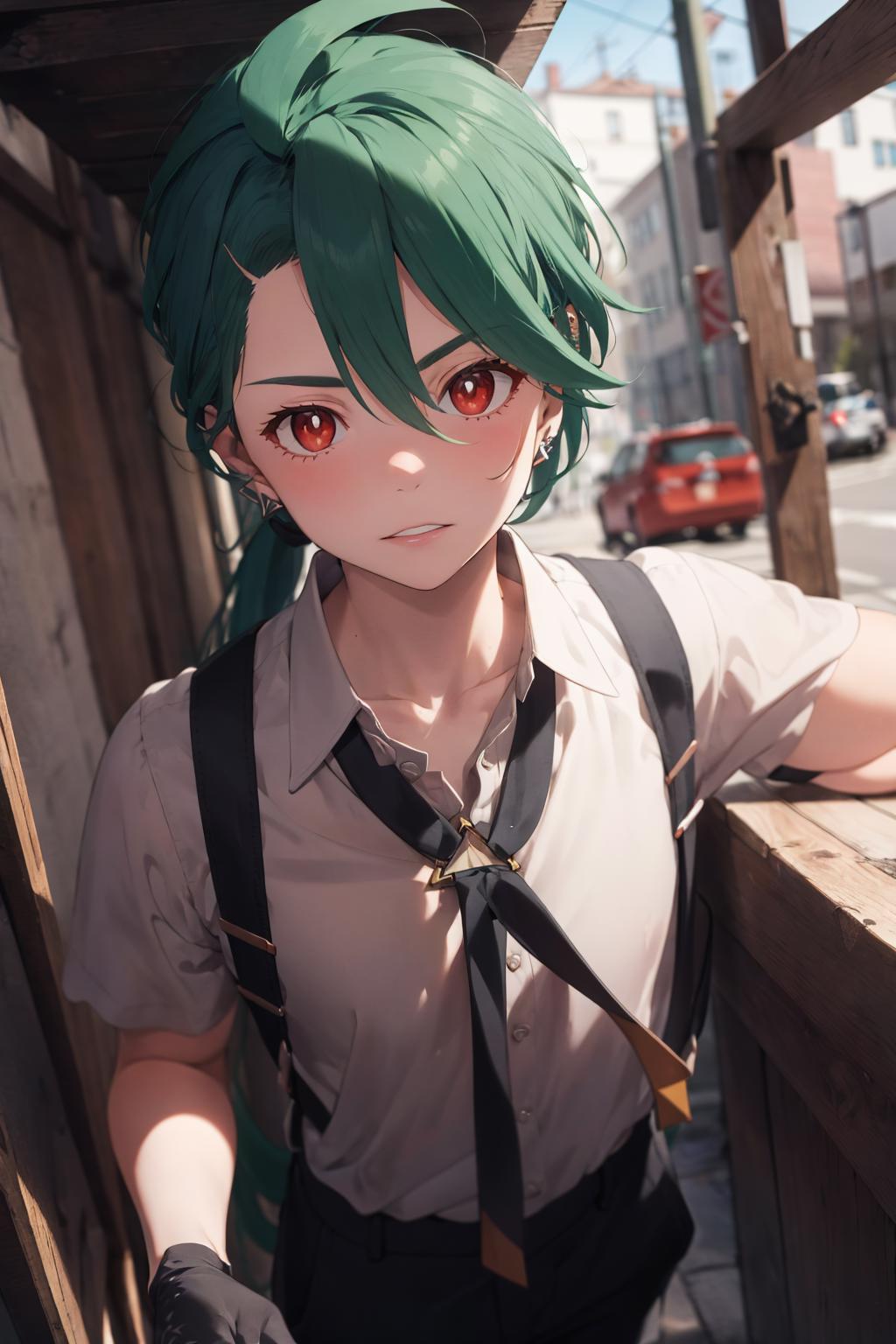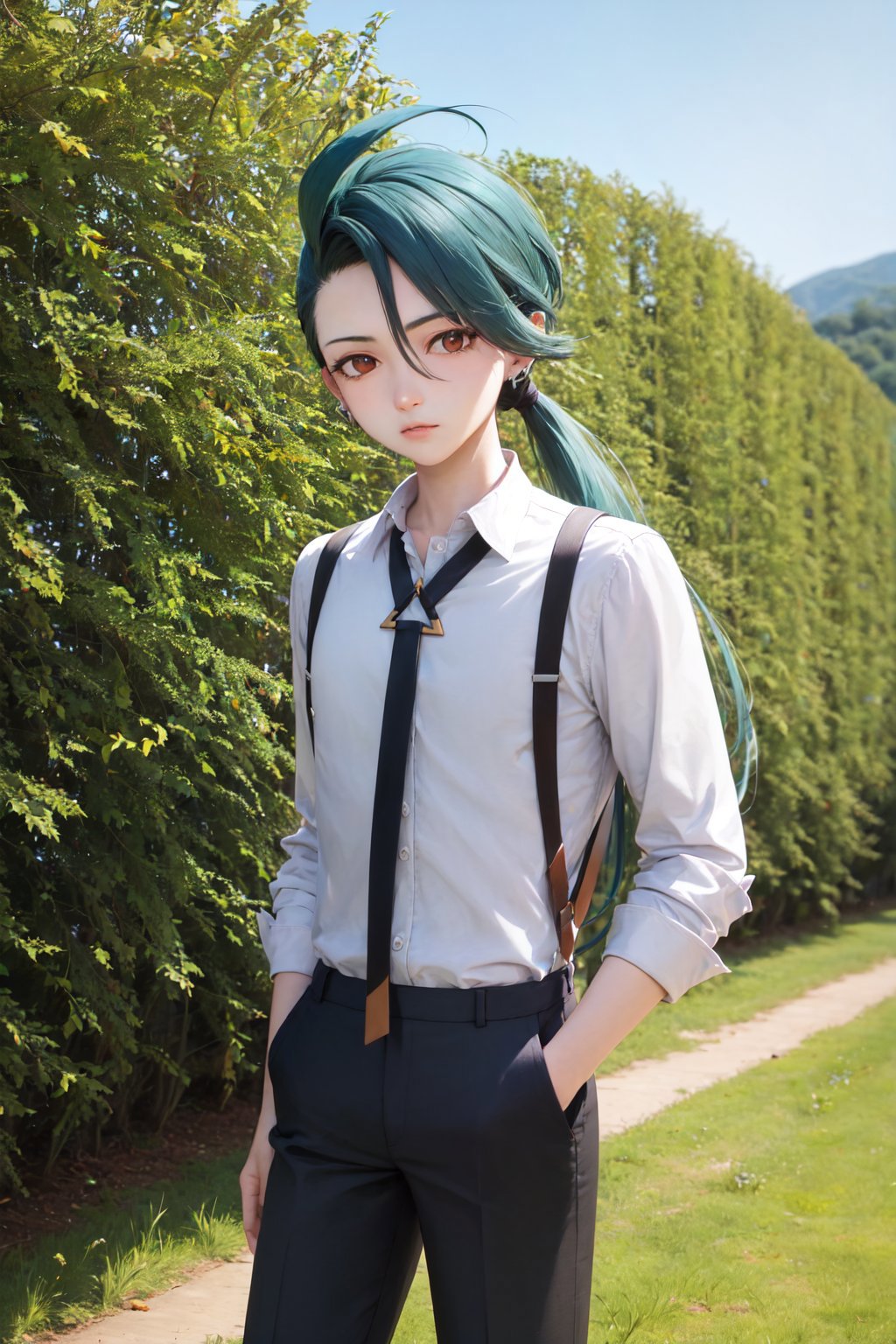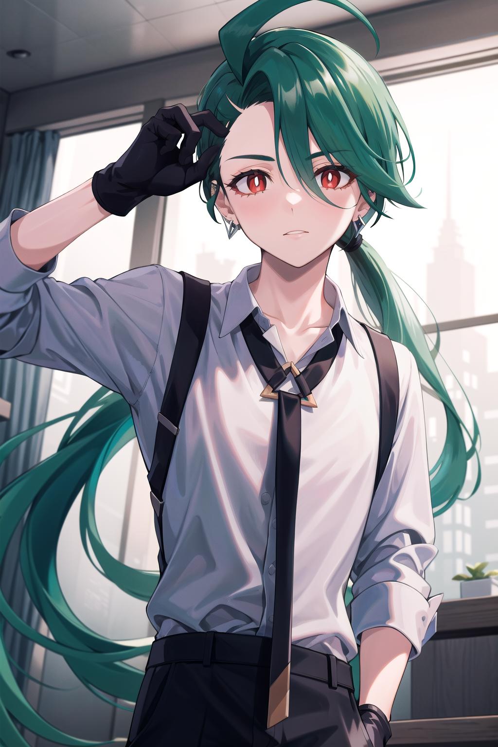 Default Outfit: grey collared shirt, necktie, suspenders, black pants, gloves, earrings