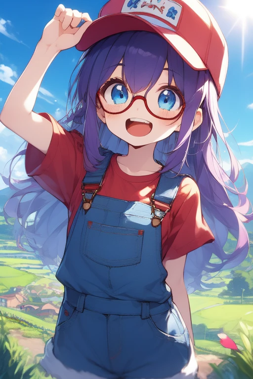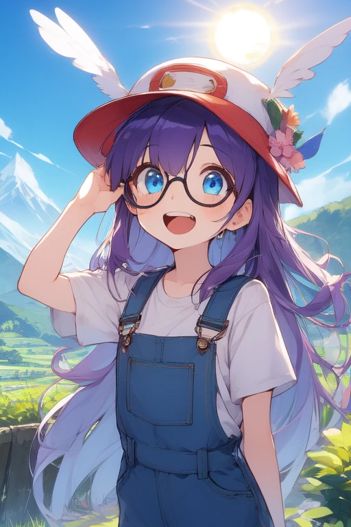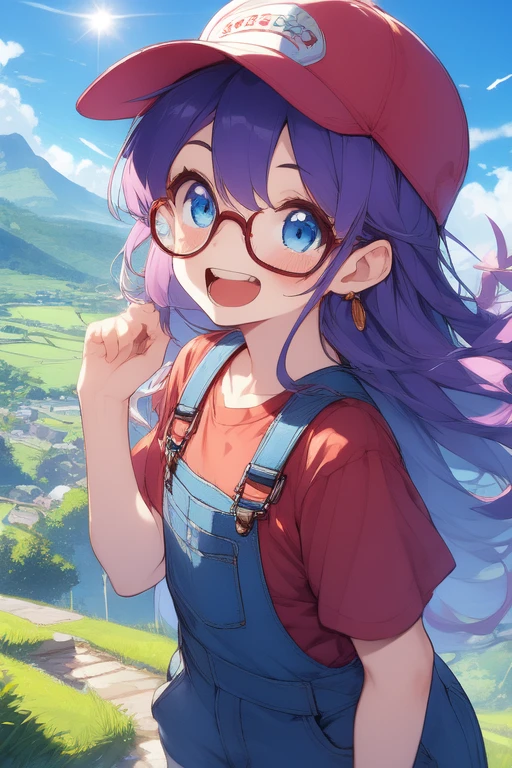arale,arale from arale,glasses, blue eyes, long hair, purple hair, pink baseball cap with white feathers on both sides, overalls,red shirt, short sleeves,solo