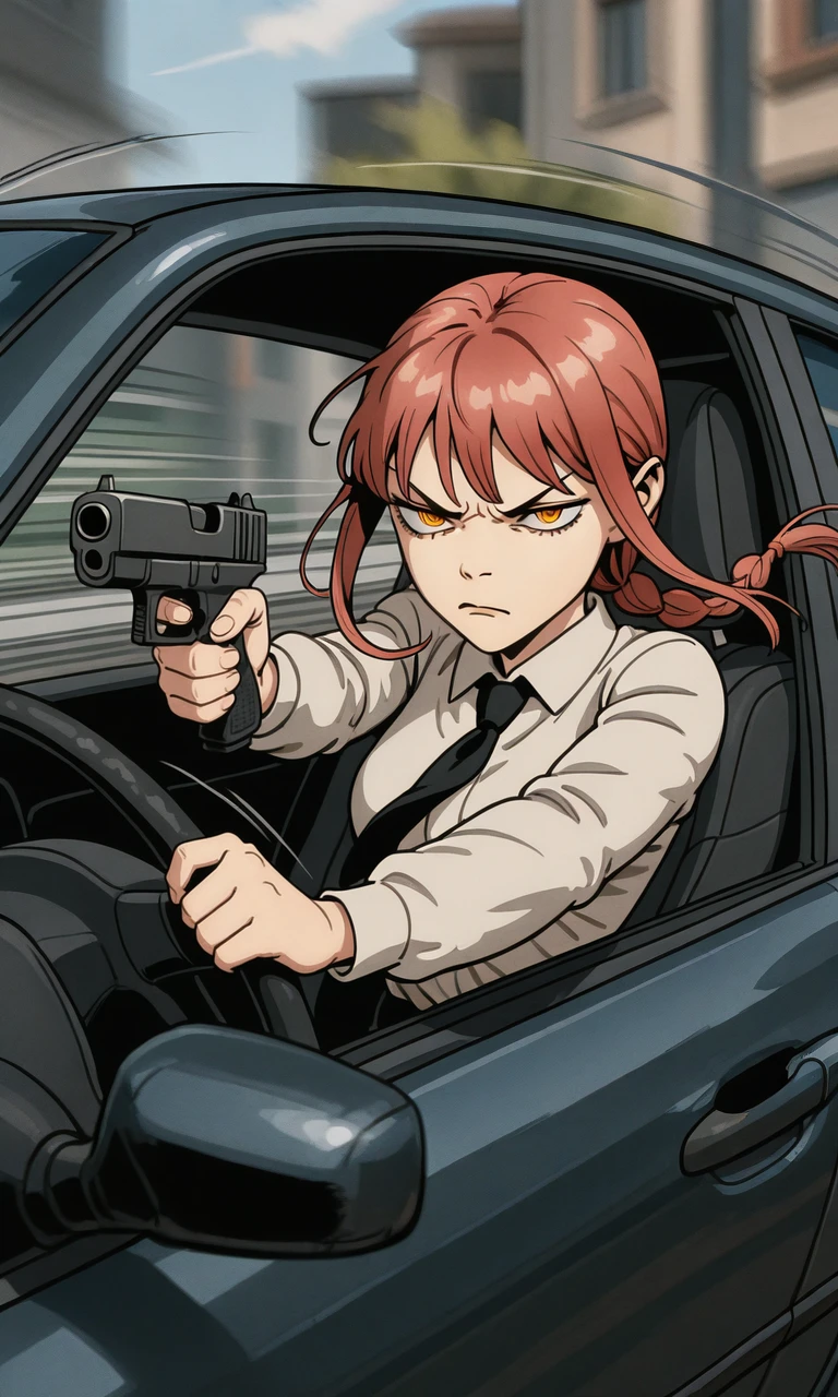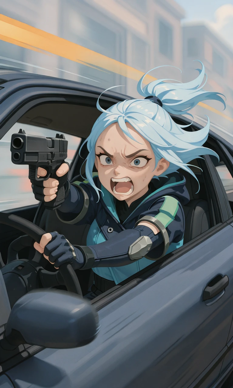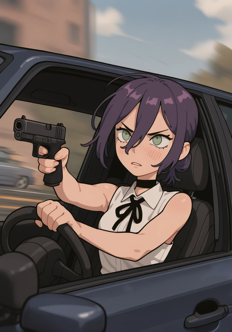 driveby, driving, holding gun, aiming, car, close-up, steering wheel