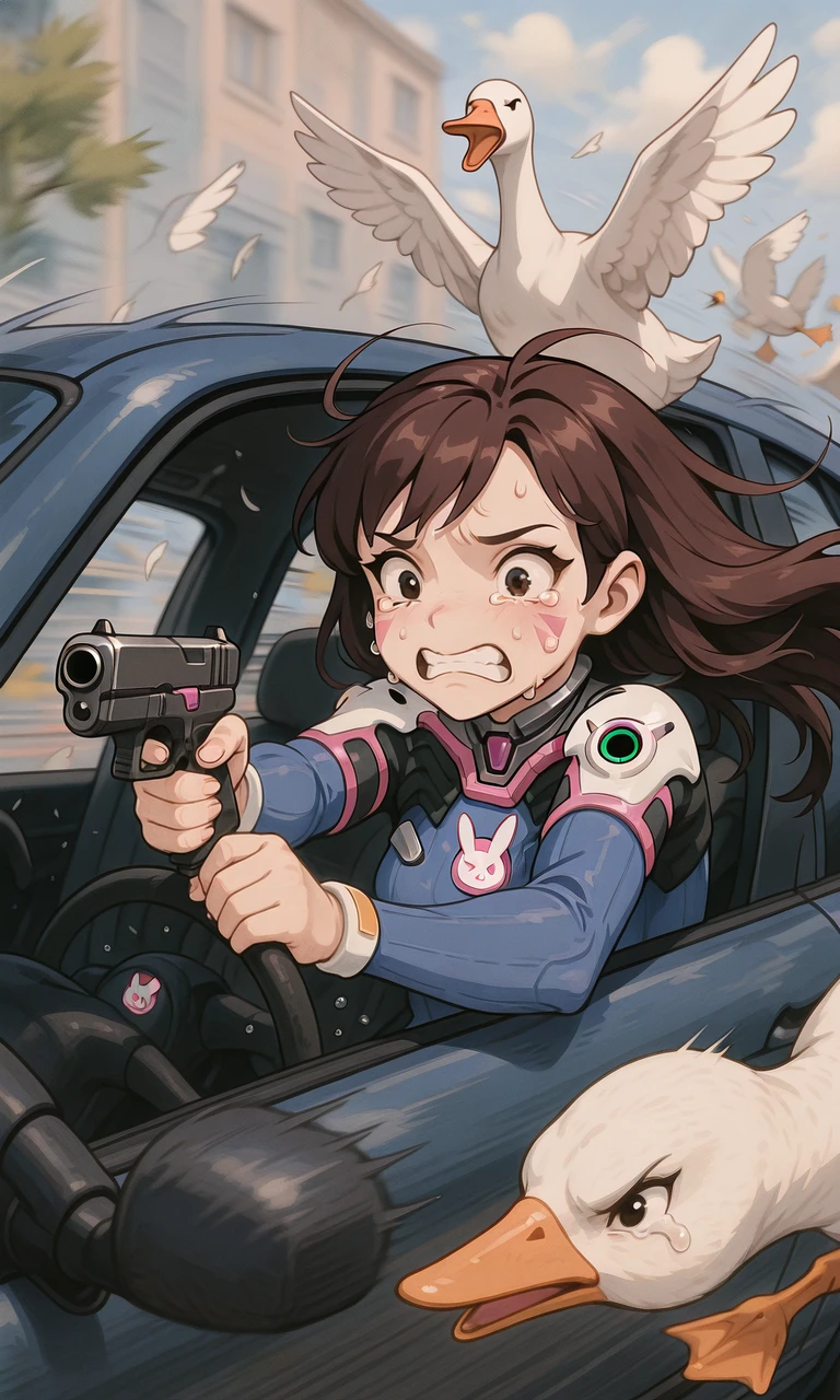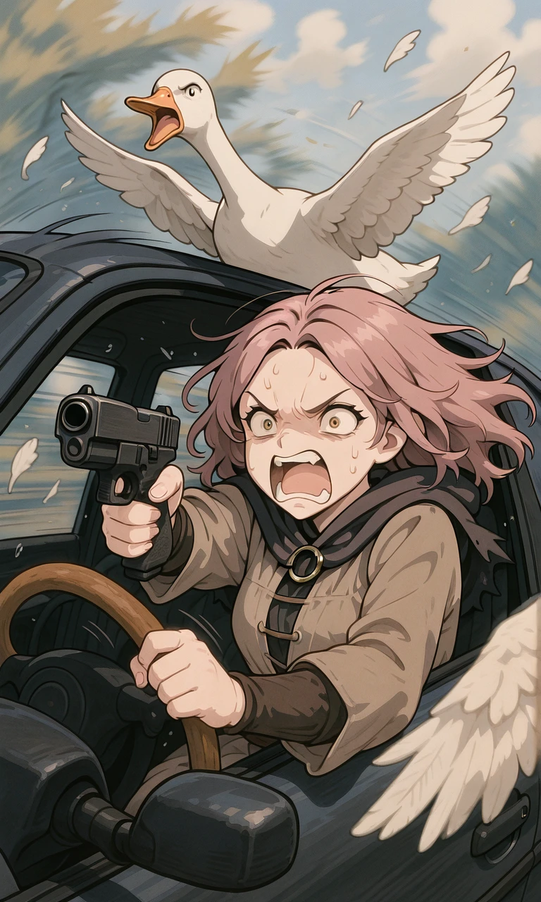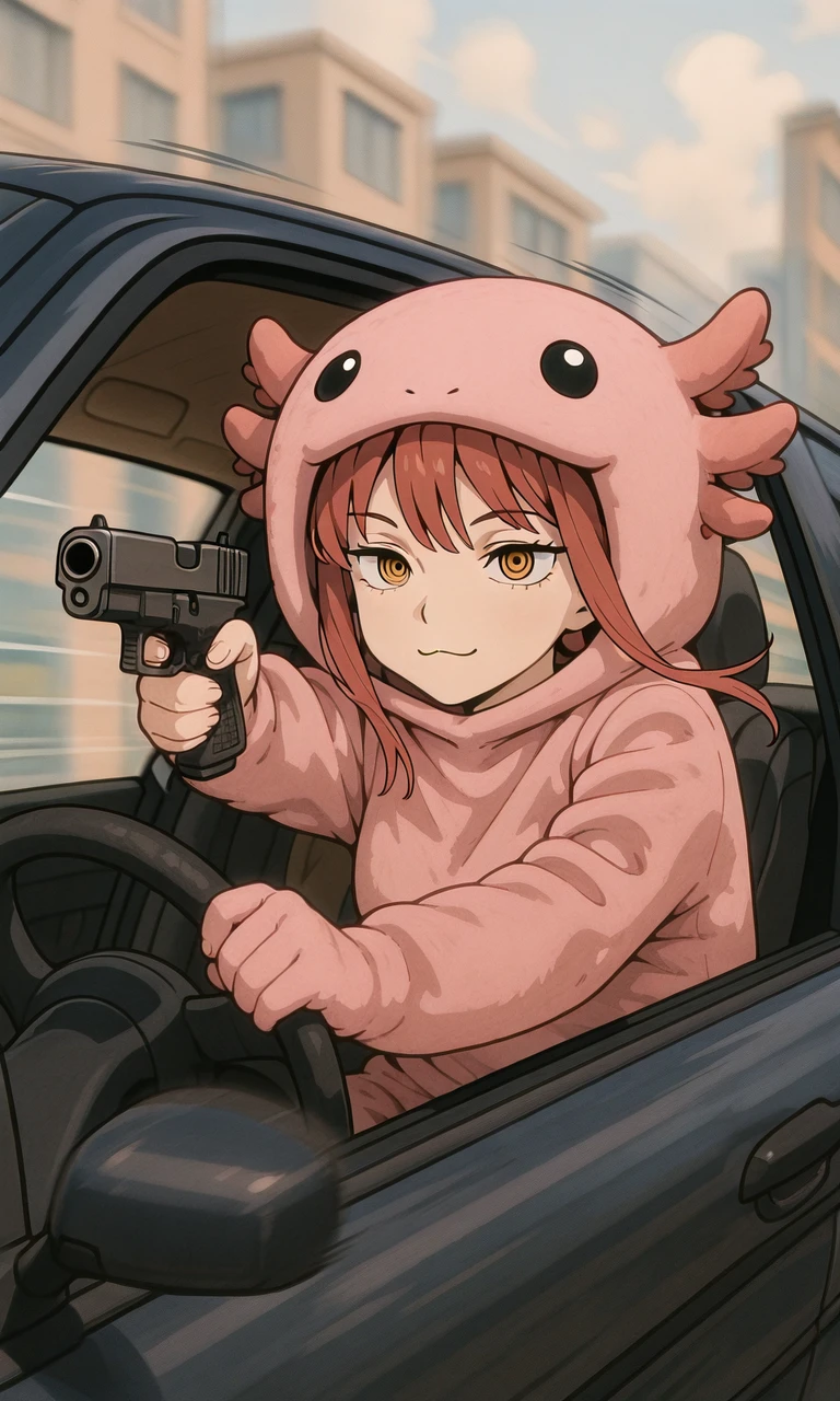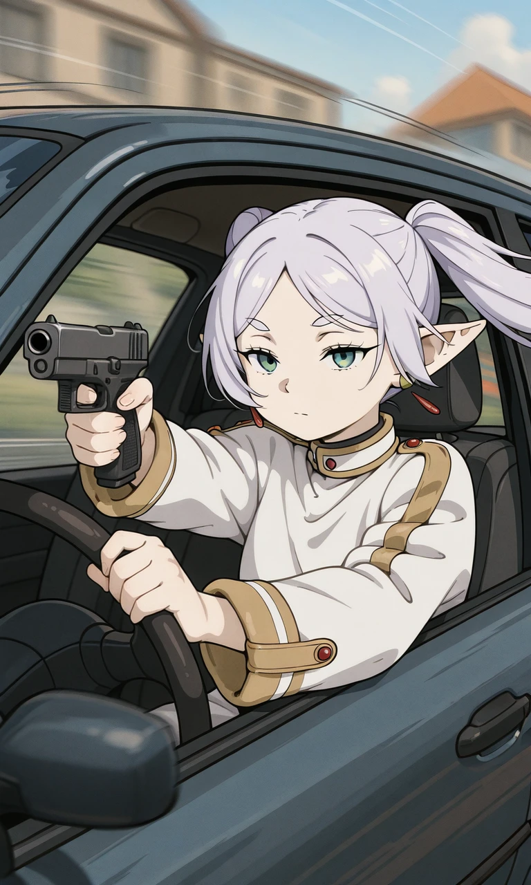 driveby, driving, holding gun, aiming, car, close-up, steering wheel