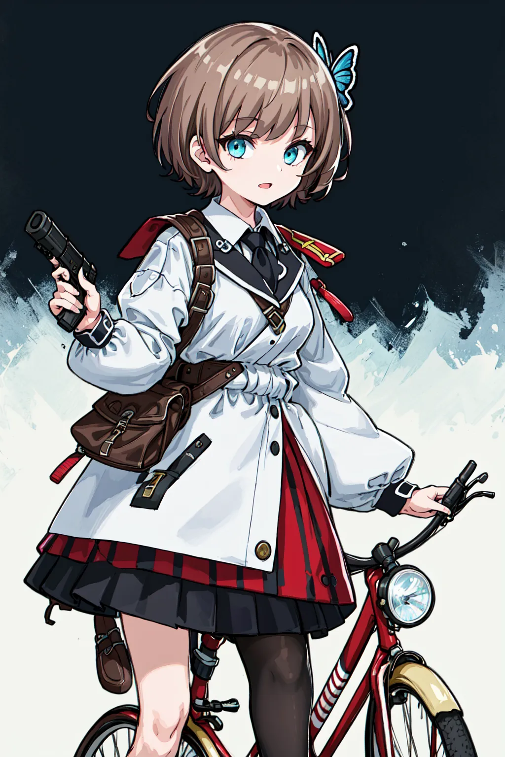 brown hair, swept bangs, cyan eyes, sode bangs, short hair, butterfly hairpin, holding handgun, bicycle, (child),