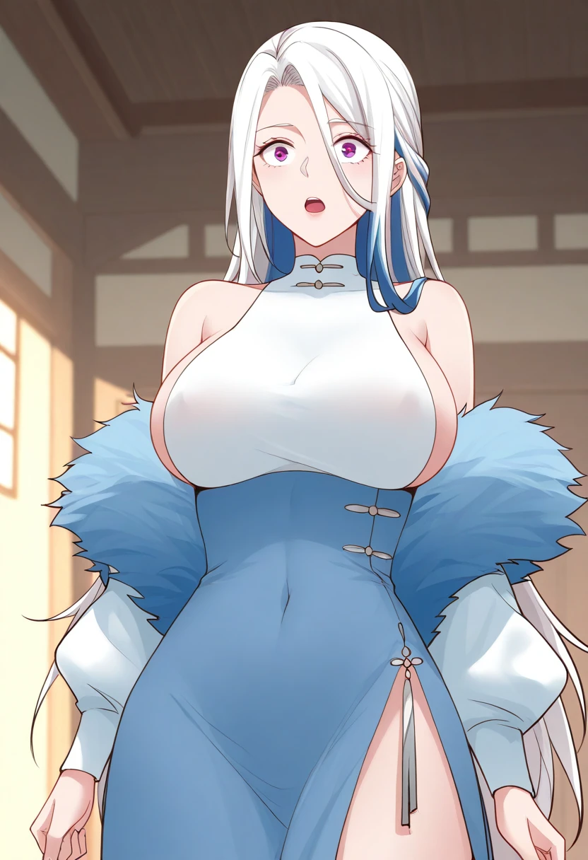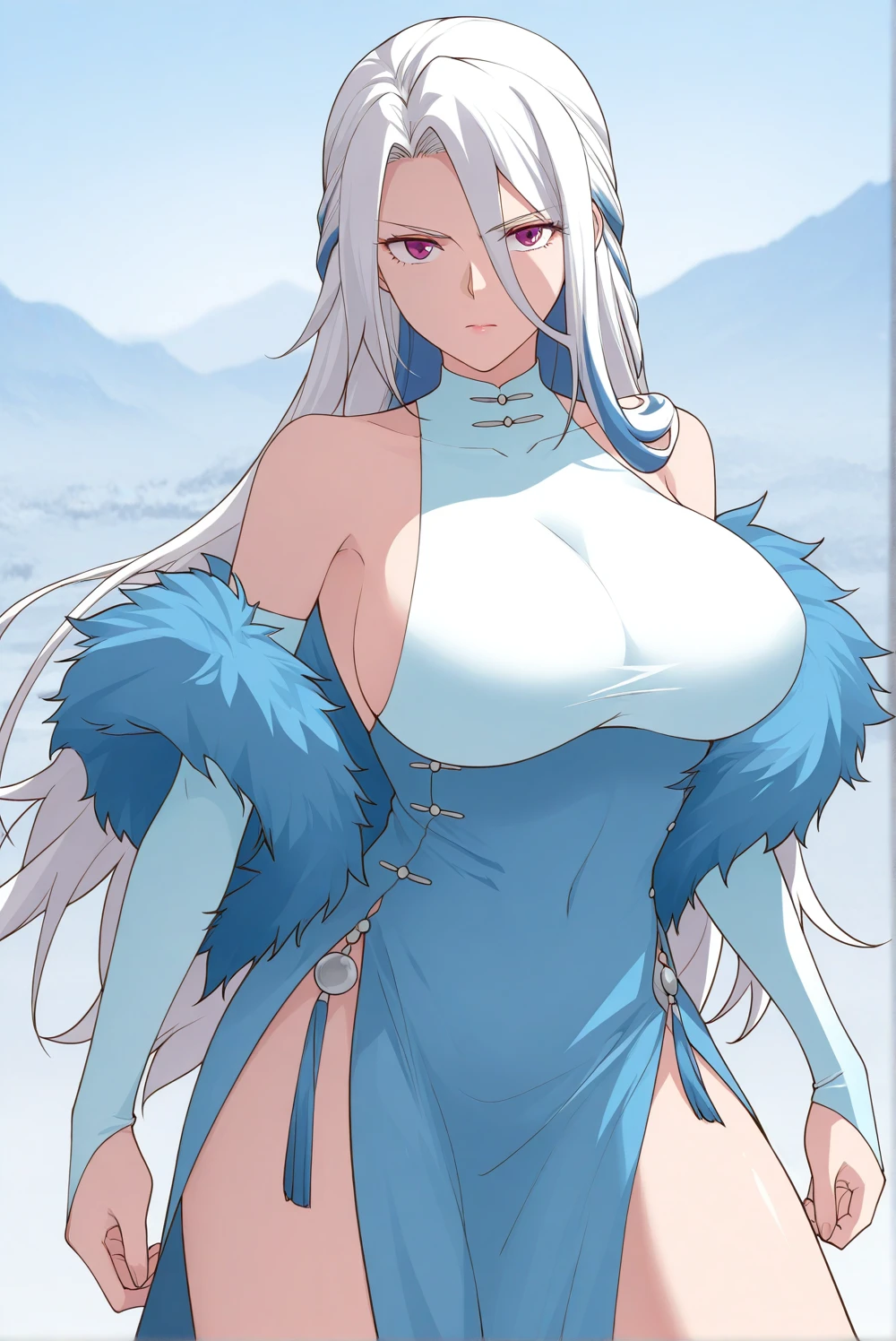 jiyao, woman, 1girl, long hair, breasts, dress, bridal gauntlets, side slit