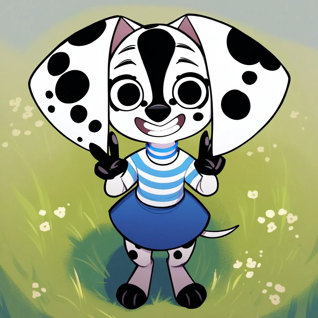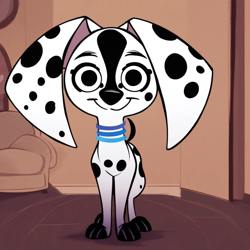 Dog, dalmatian, white and black fur, black spots, black paws, thin tail, large ears, small body, two collars,