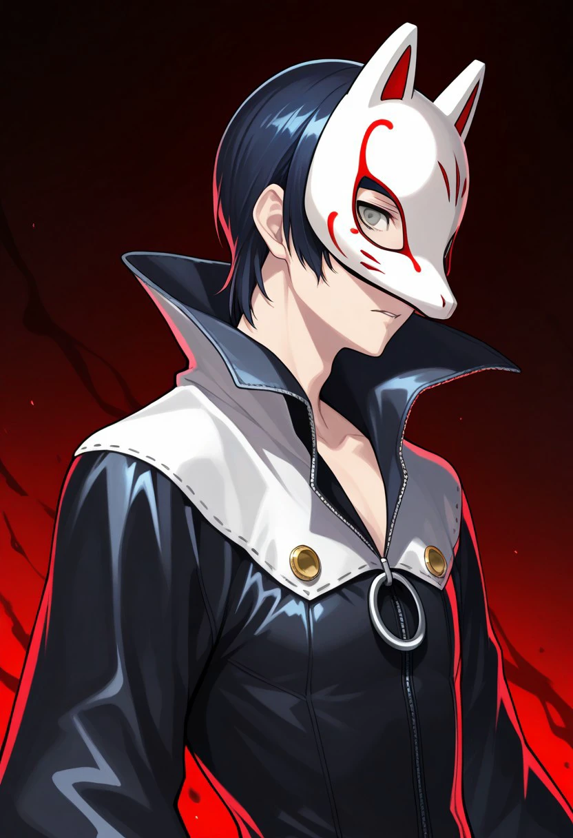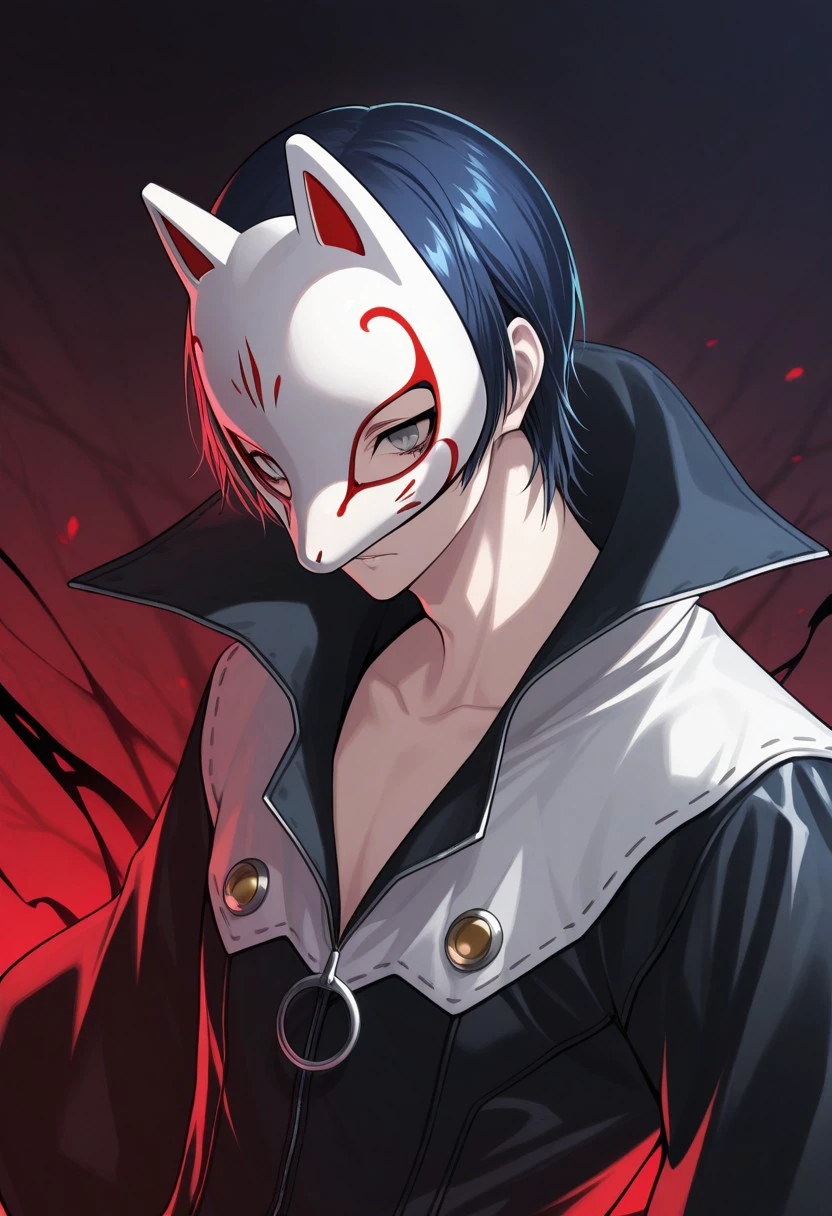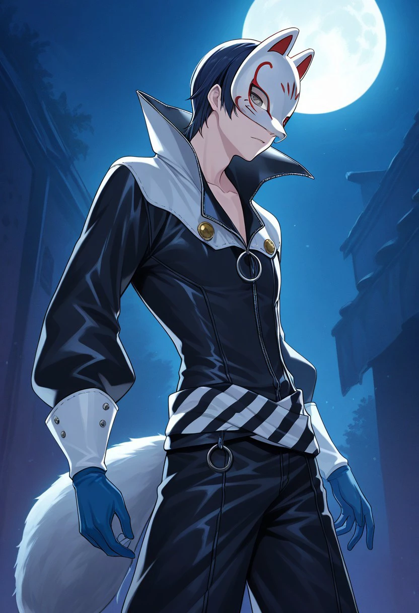 yusuke, 1boy, male focus, solo, grey eyes, blue hair, short hair, thief outfit, mask, fox mask, jacket, black jacket, high collar, long sleeves, gloves, blue gloves, zipper, pants, black pants, tail, fox tail, boots, white footwear,