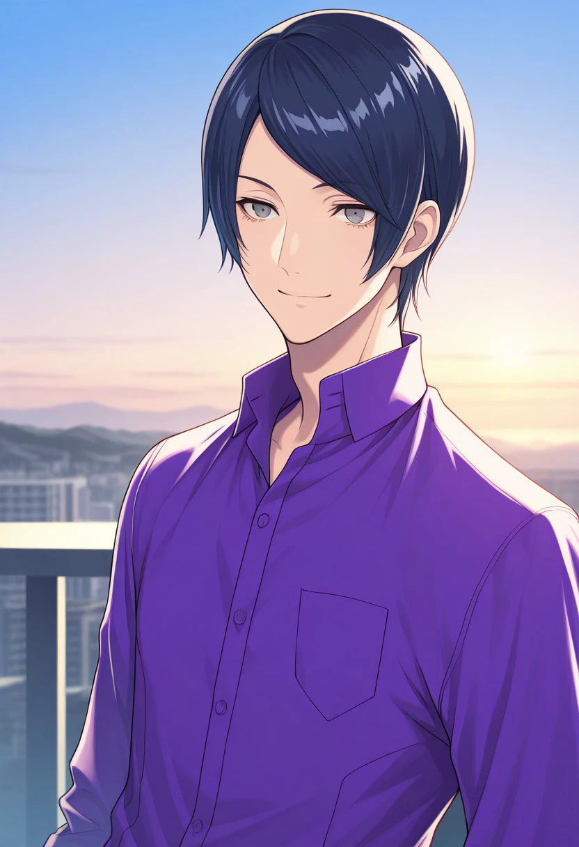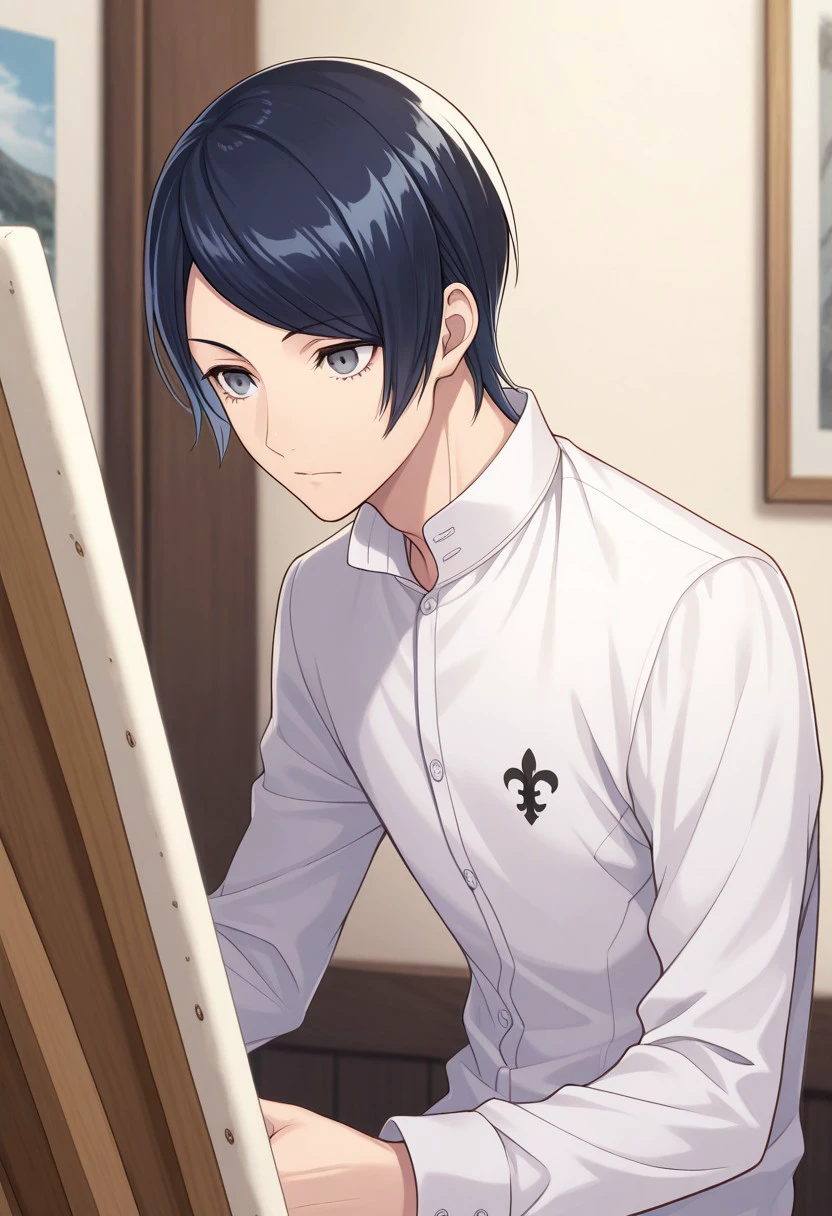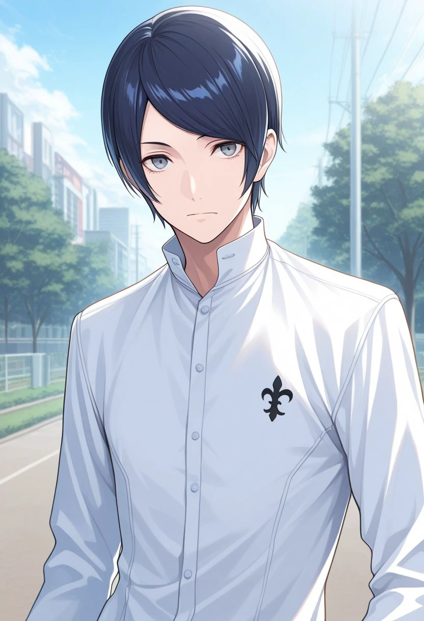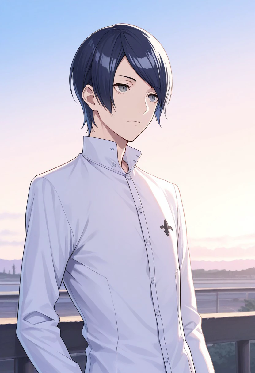 yusuke, 1boy, male focus, solo, grey eyes, blue hair, short hair, swept bangs, school uniform, shirt, white shirt, collared shirt, long sleeves, pants, black pants, shoes, black footwear,