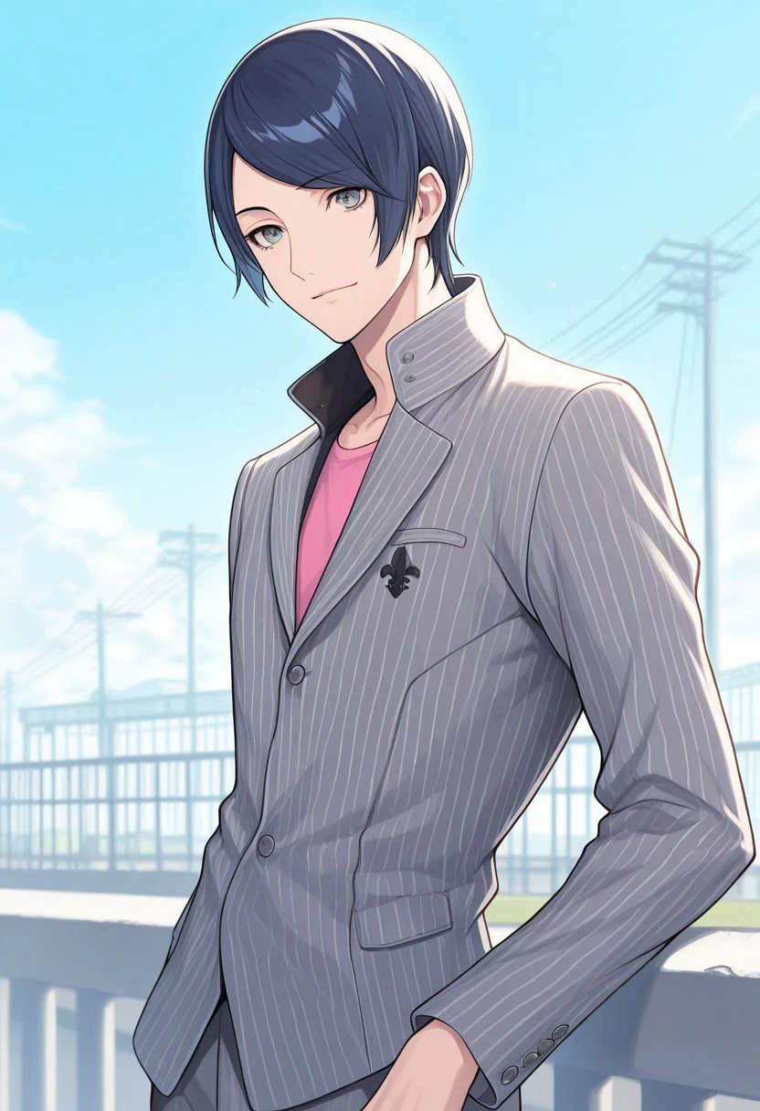 yusuke, 1boy, male focus, solo, grey eyes, blue hair, short hair, swept bangs, shirt, pink shirt, jacket, grey jacket, long sleeves, striped jacket, striped, pinstripe pattern, pants, black pants,