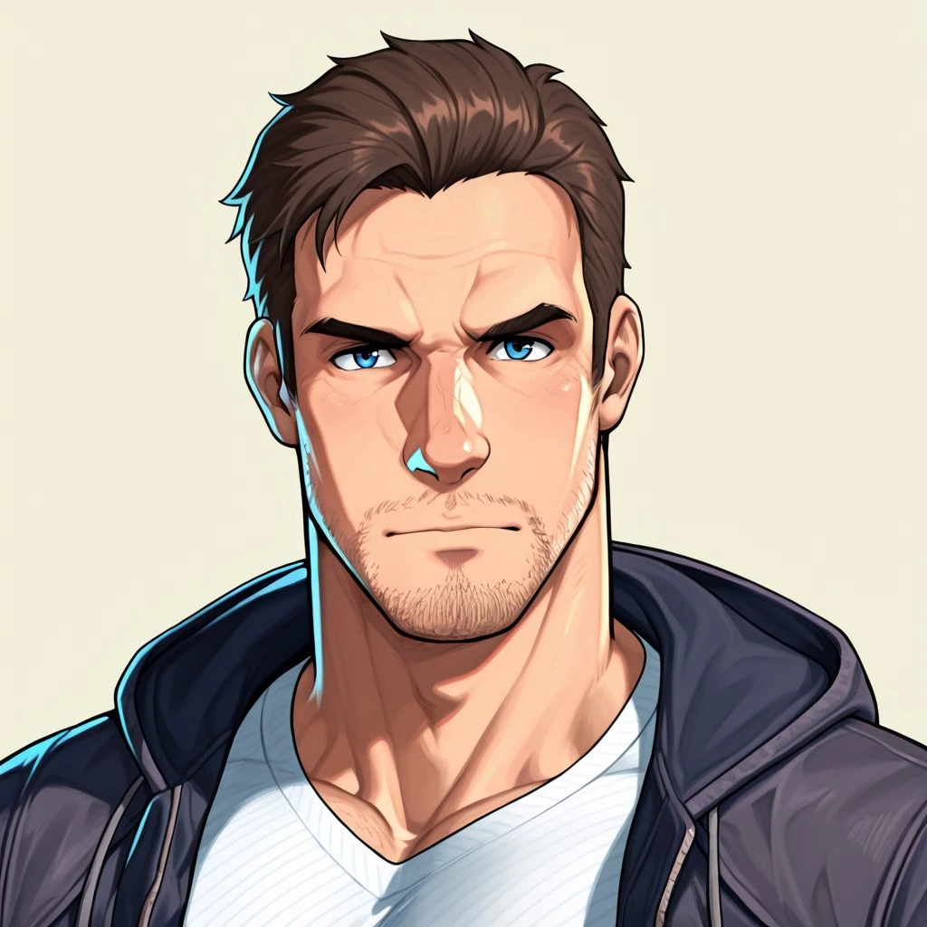 Propms: GavinR, game character, 1boy, solo, male focus, brown hair, black eyes, facial hair, stubble, jacket, shirt,