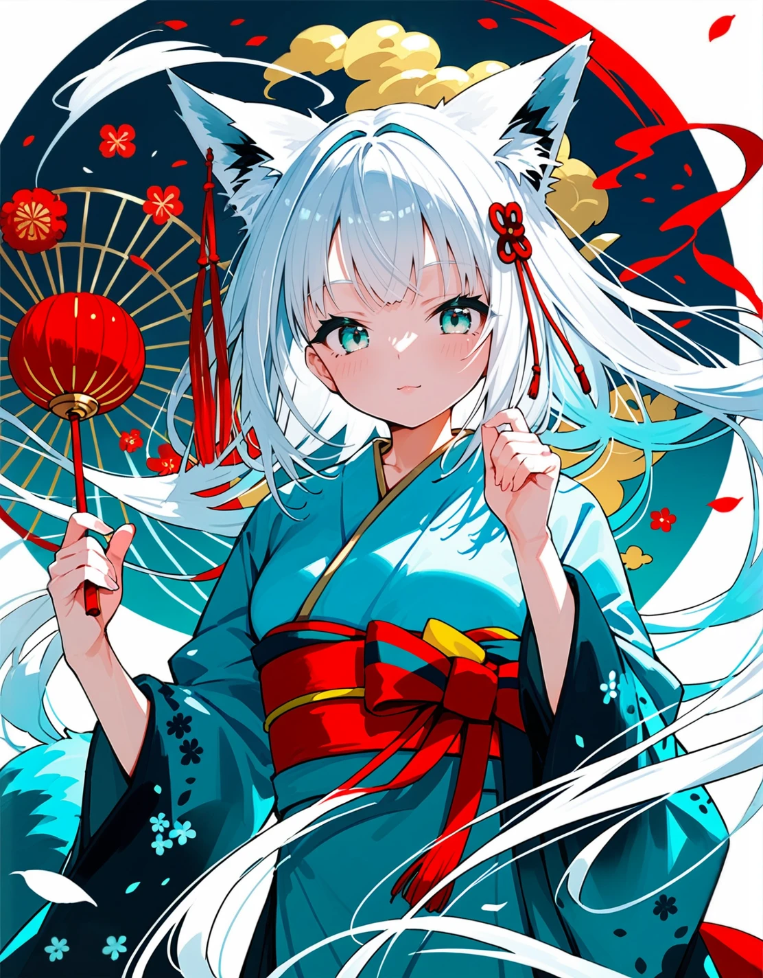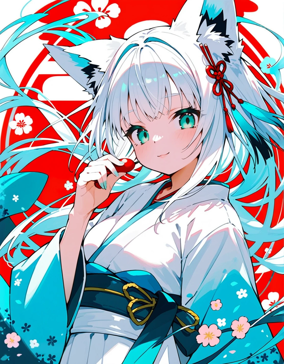 触发词:shirakami fubuki (new year),aqua_eyes,animal ears,white hair,fox ears,japanese clothes