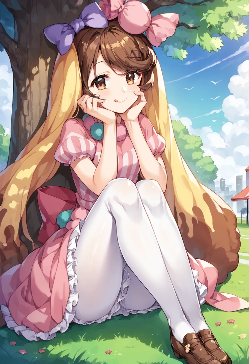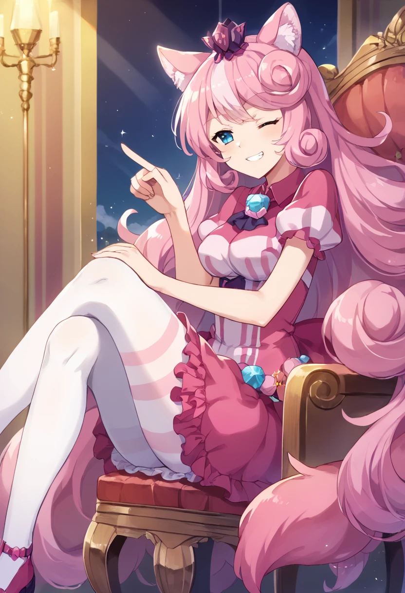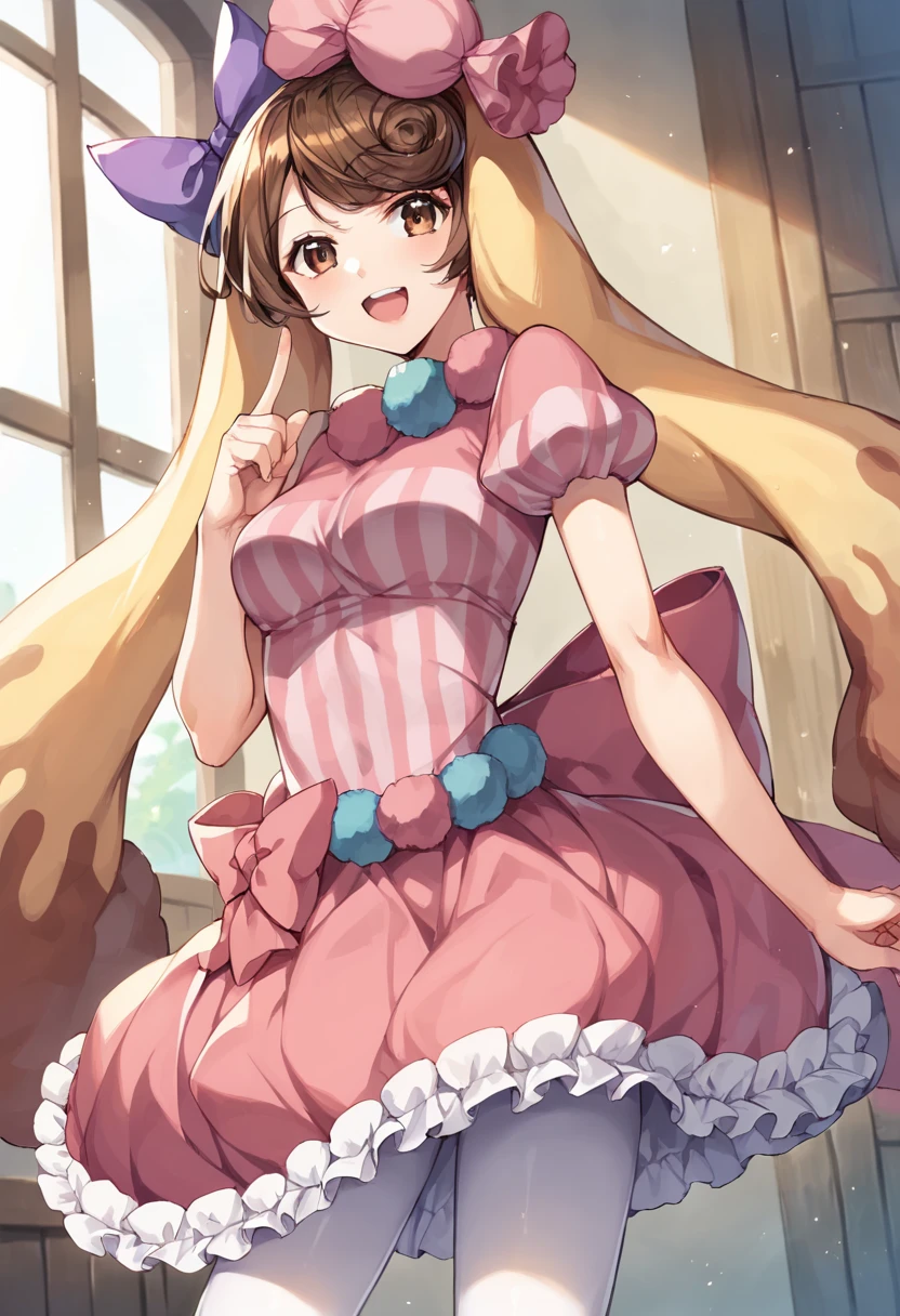 pink dress,white pantyhose,striped,short sleeves,puffy sleeves,