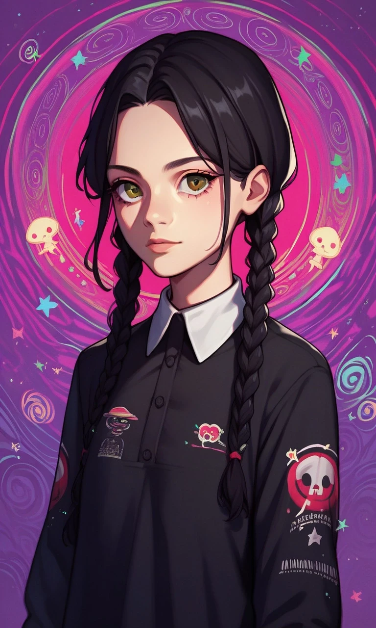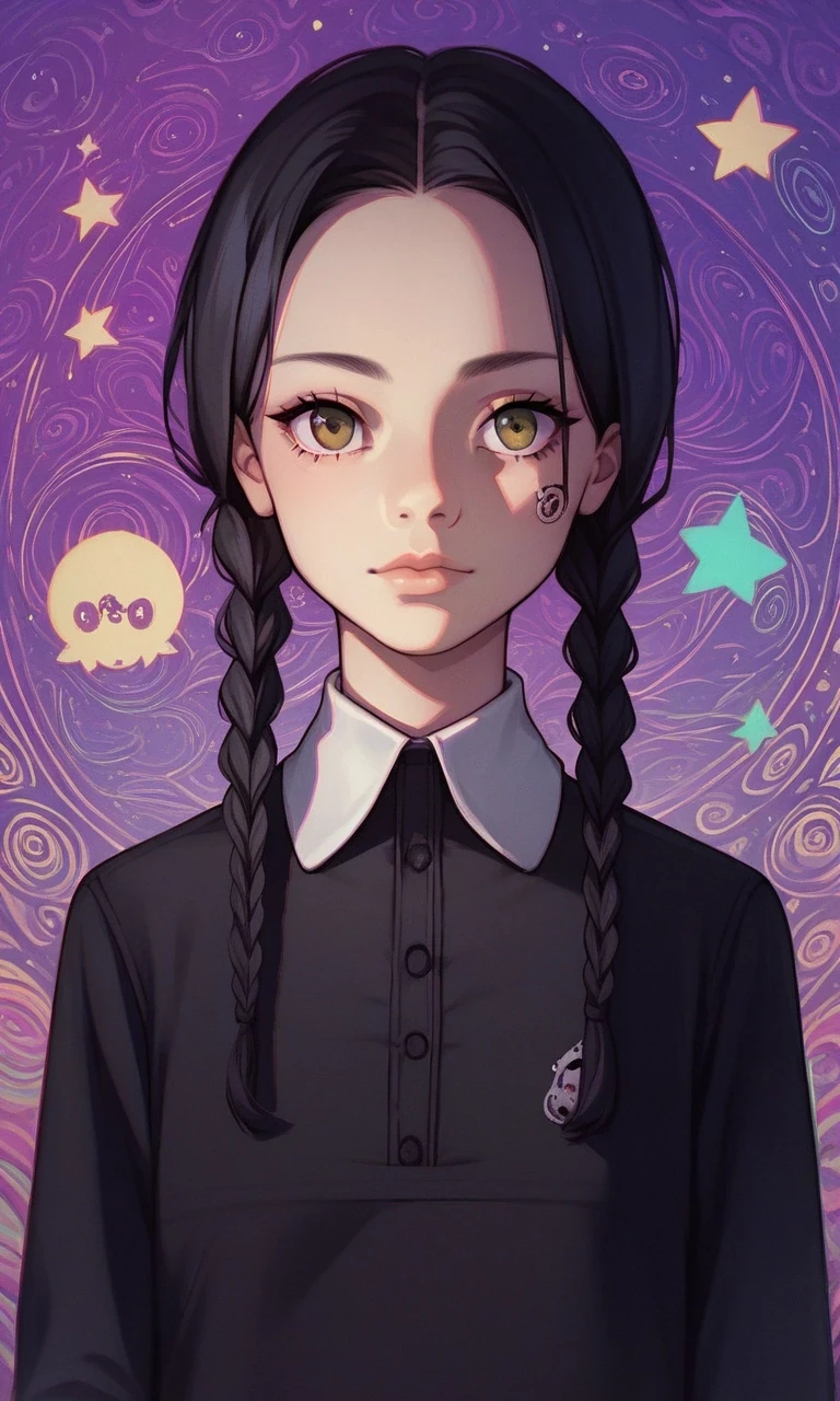 1girl, black hair, twin braids, brown eyes, collared dress, black dress, long sleeves