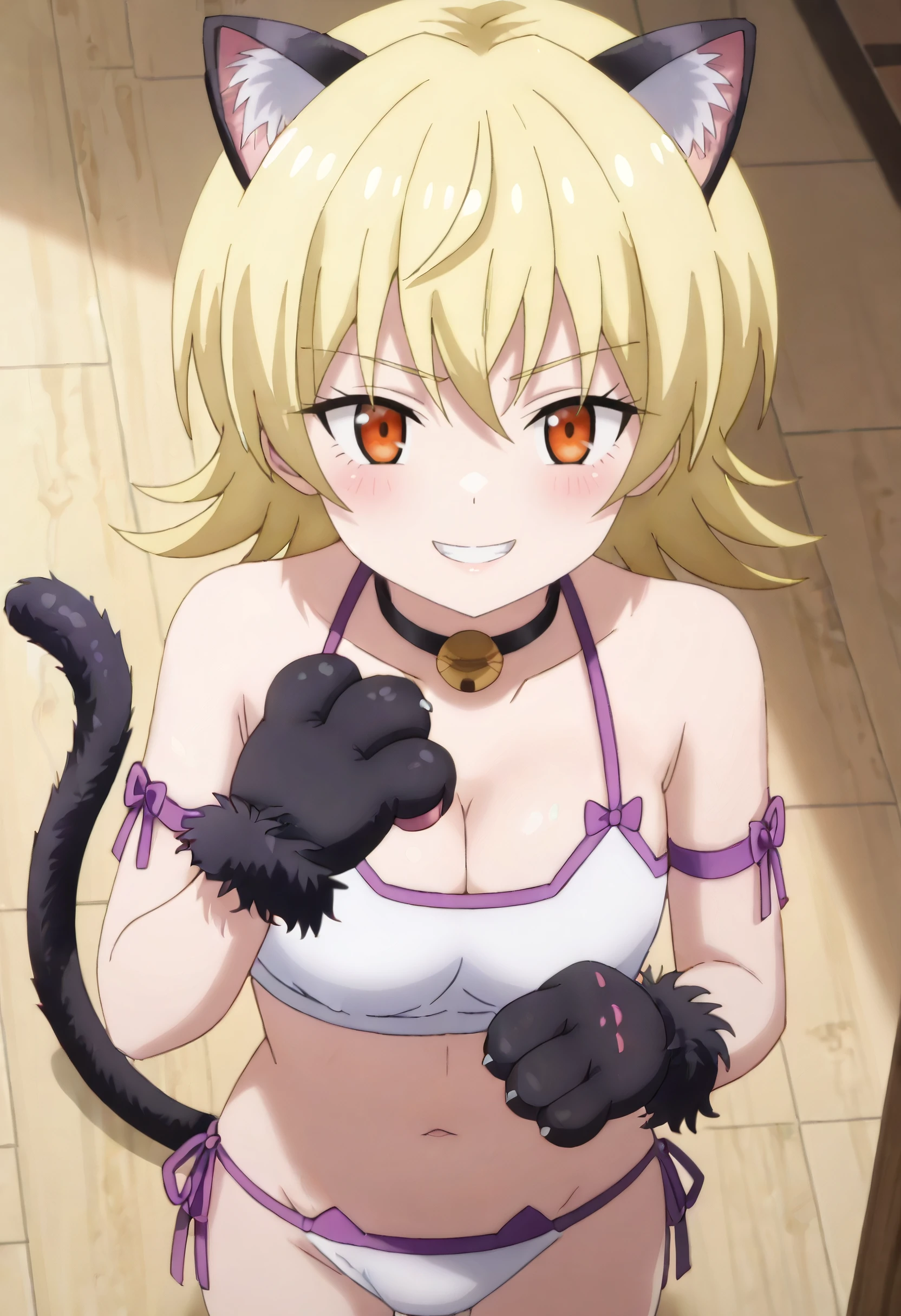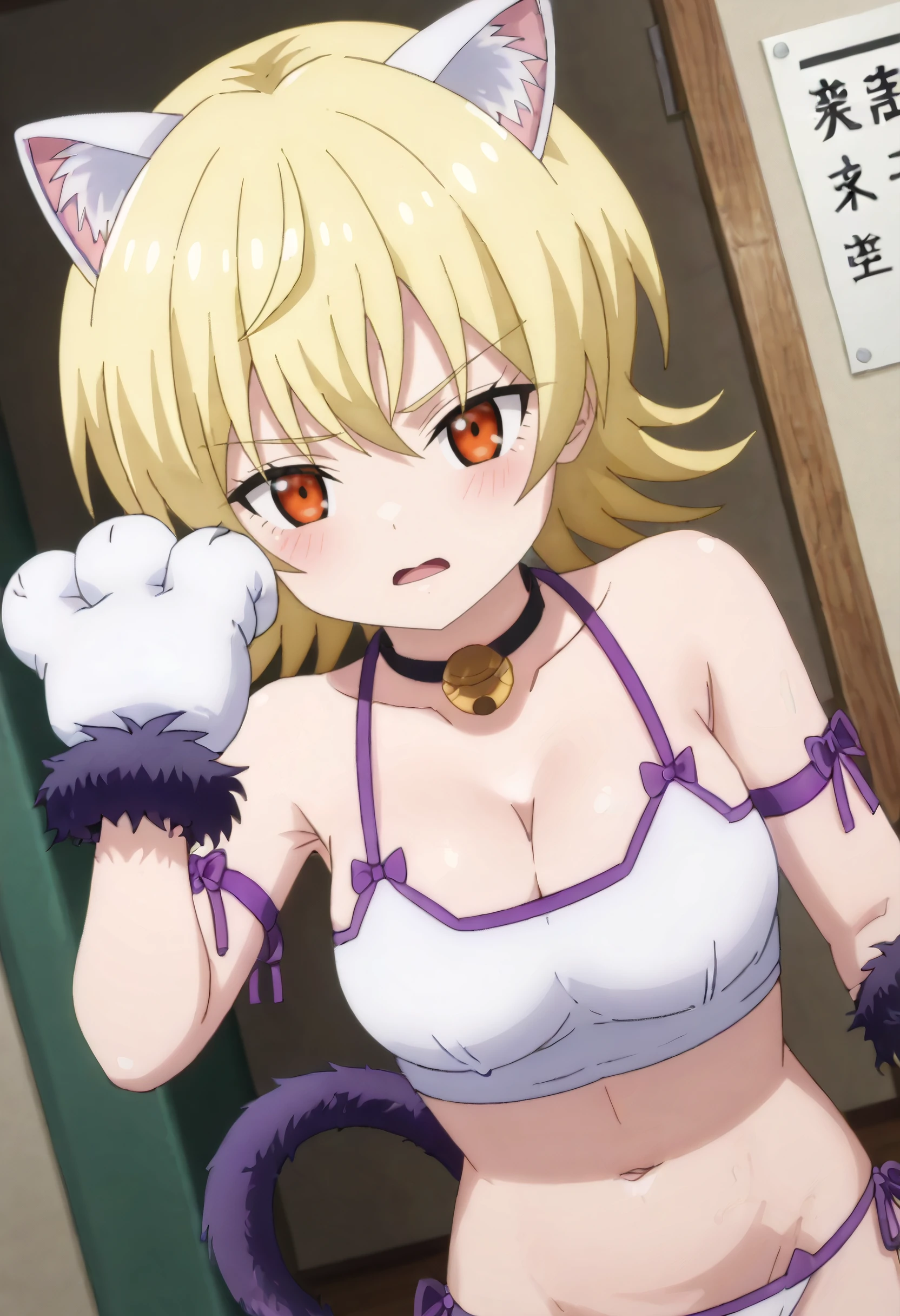 YuzuUnderwear, bell, neck bell, jingle bell, choker, cat ears, cat lingerie, cat tail, fake animal ears, collar, paw gloves, cat paws, cleavage, tail, gloves, arm ribbon, spaghetti strap, bare shoulders, navel, fake tail, underwear, black choker, side-tie panties, fur-trimmed gloves, ribbon, white underwear, purple ribbon,