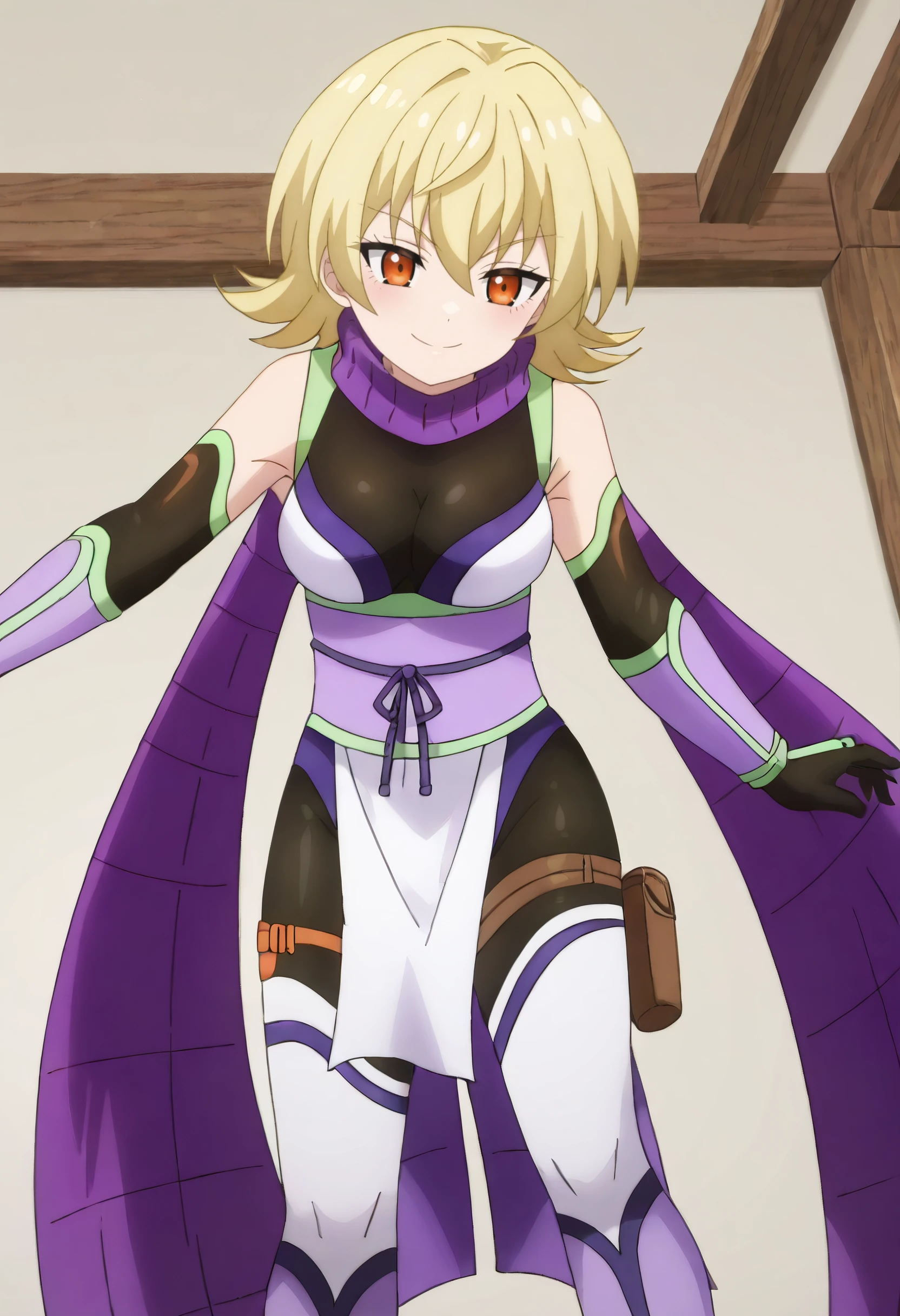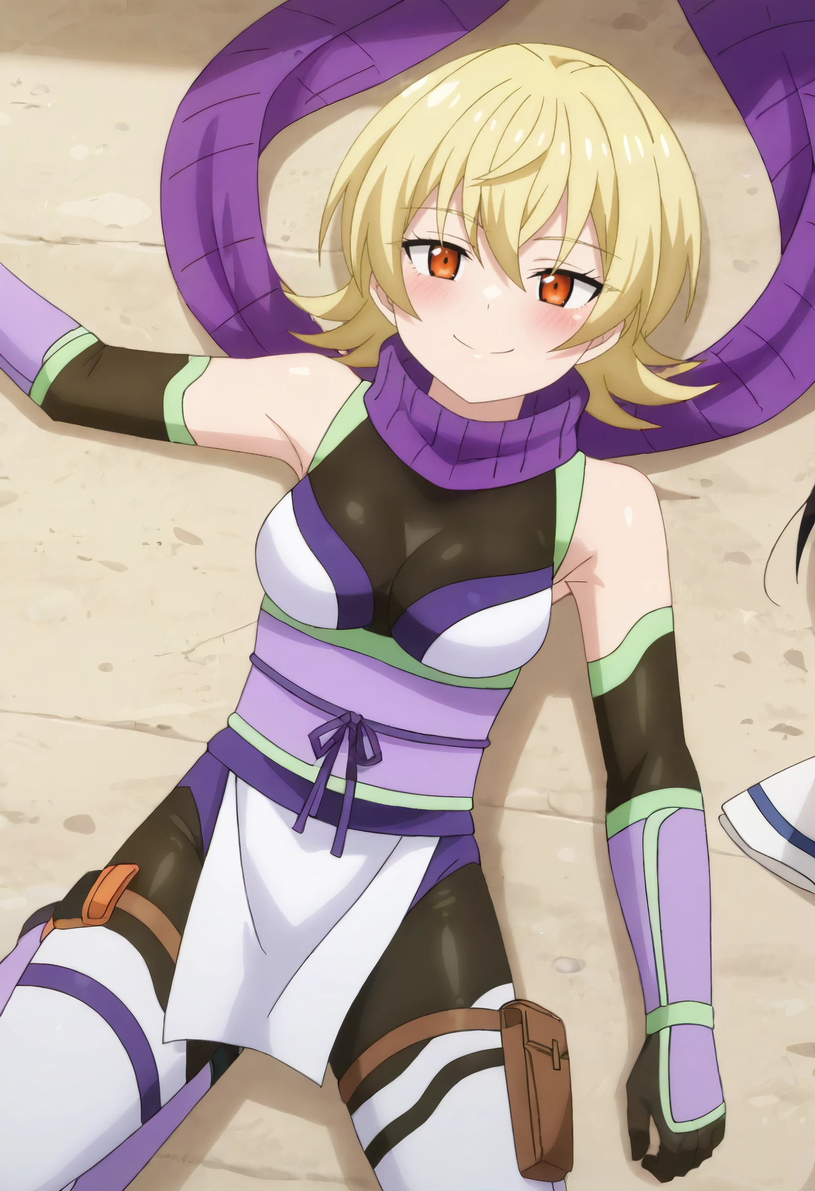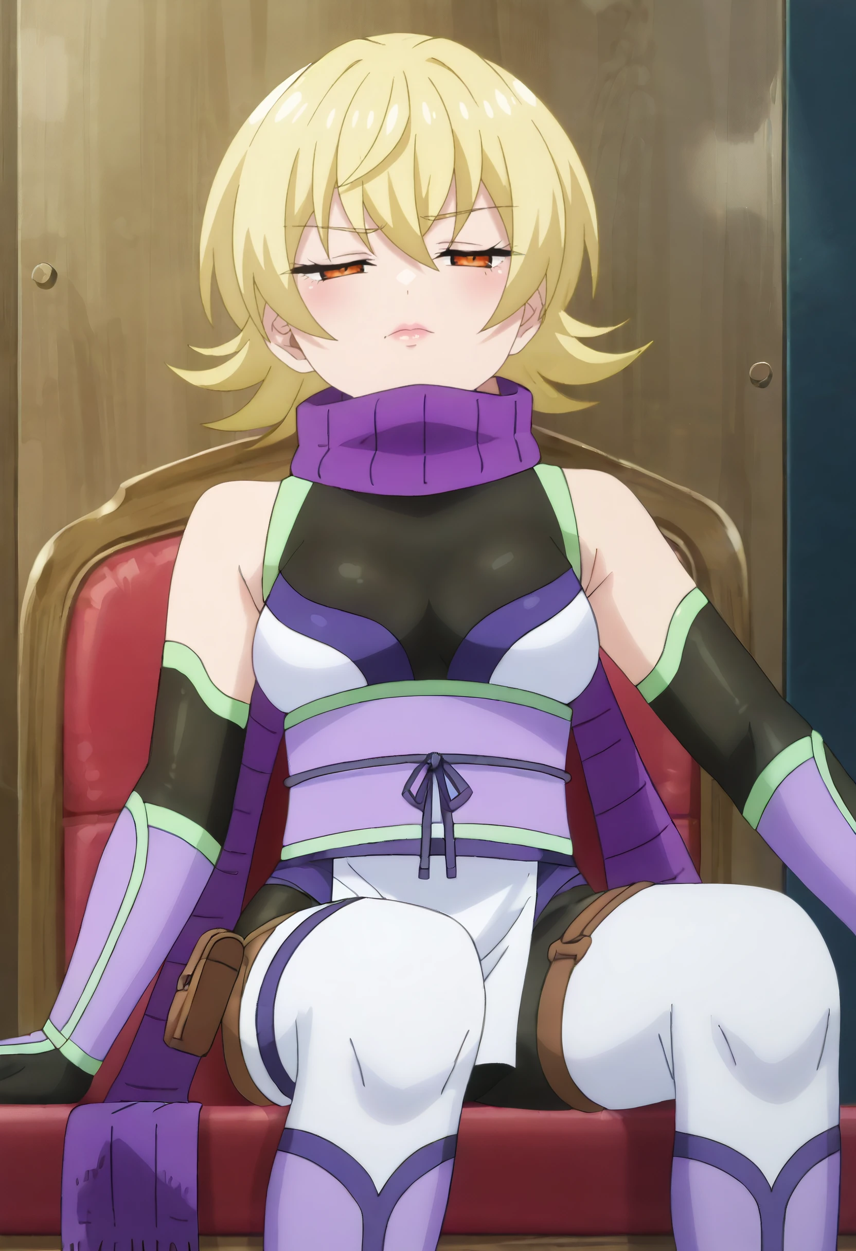 YuzuBodysuit, purple scarf, ninja, bare shoulders, elbow gloves, bodysuit, sleeveless, black gloves, leotard, detached sleeves, black bodysuit, obi, pelvic curtain, boots, thighhighs, black leotard, white thighhighs, thigh strap, thigh holster, pink footwear, pink sash,