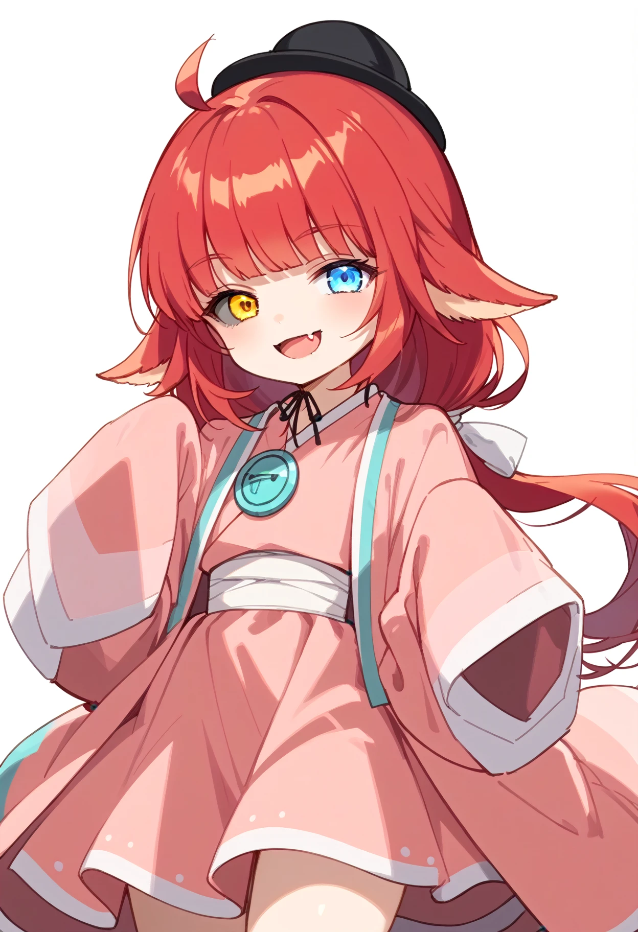 red hair, long hair,hat, ahoge, heterochromia, animal ears, long sleeves, pink dress