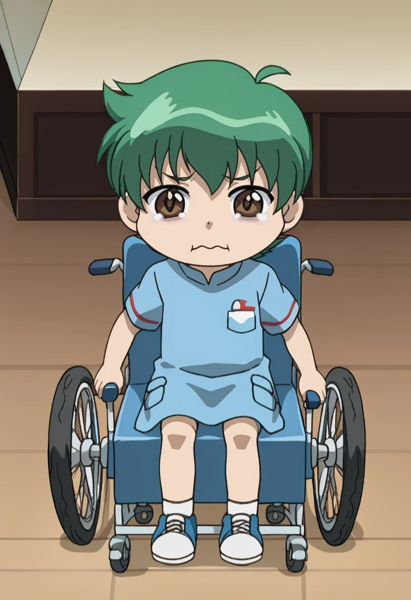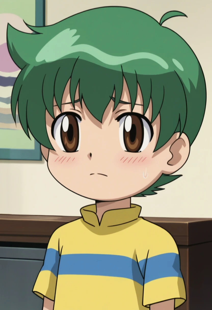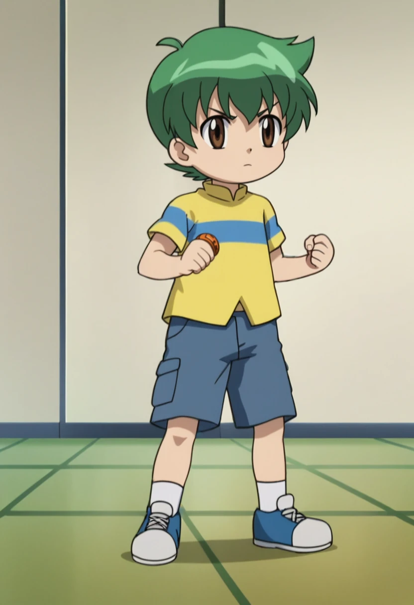 kenta, 1boy, child, male child, brown eyes, green hair, shorts, striped shirt, short sleeves, shoes,