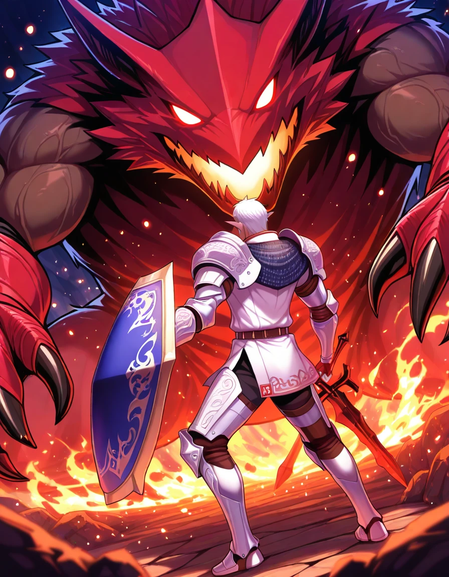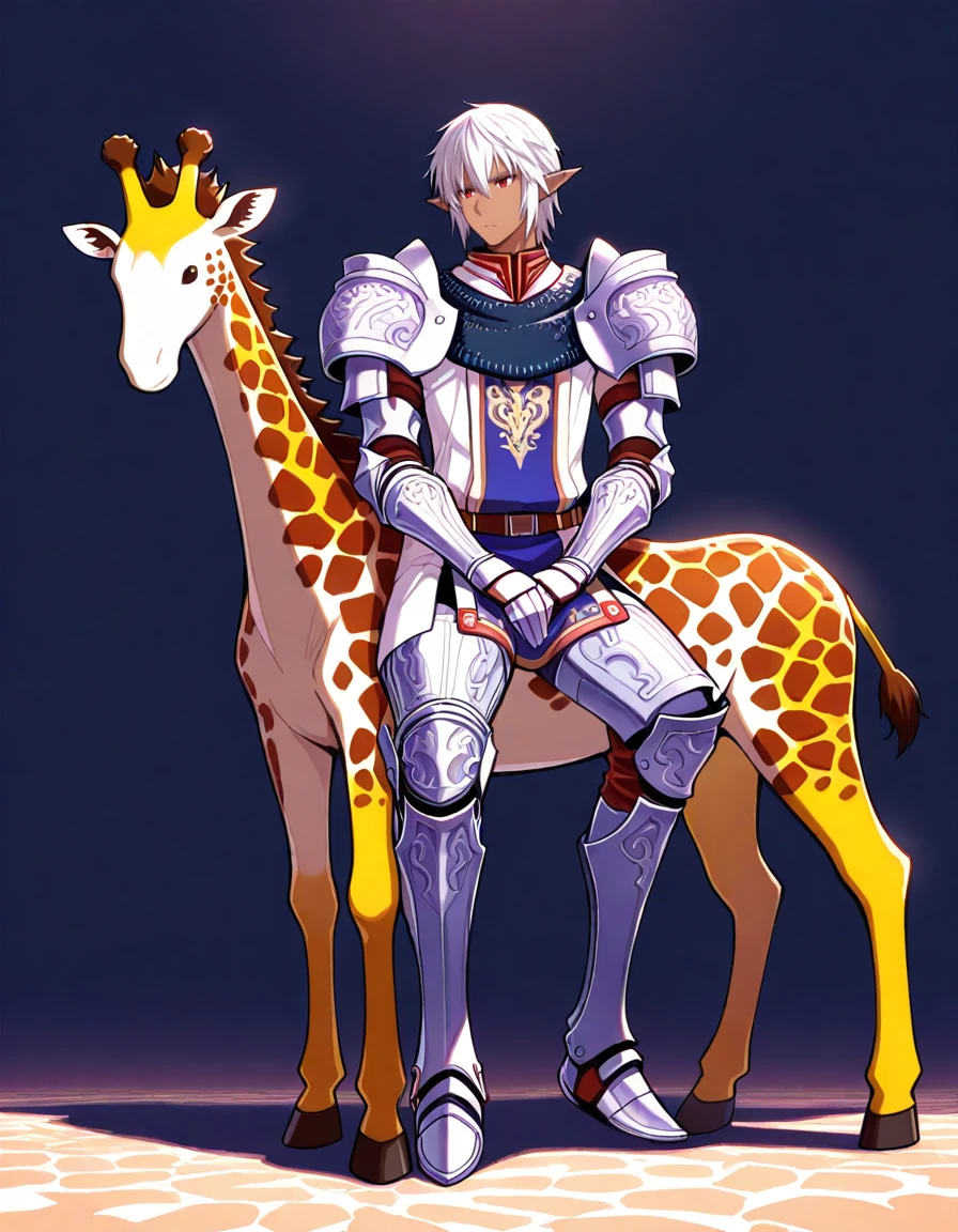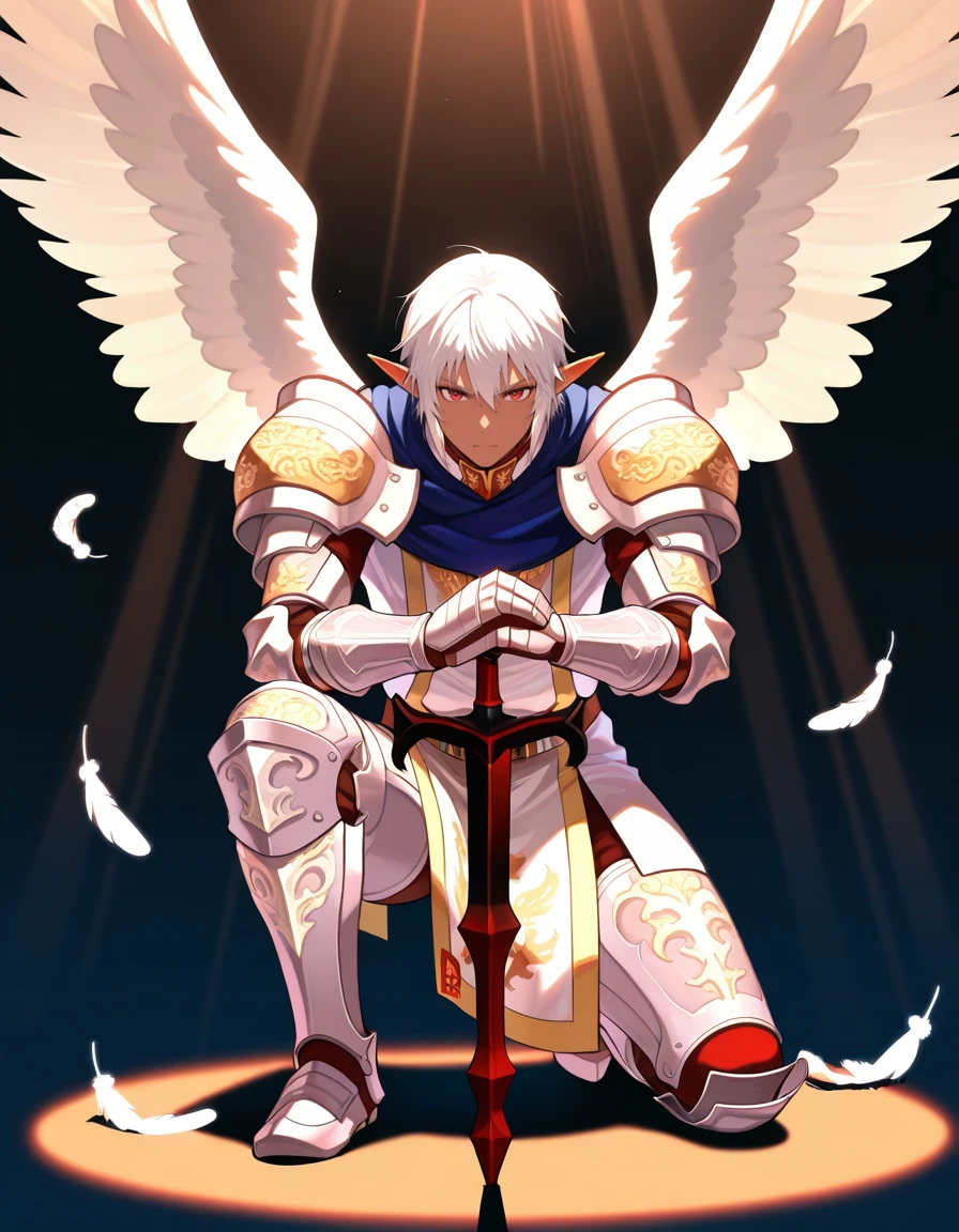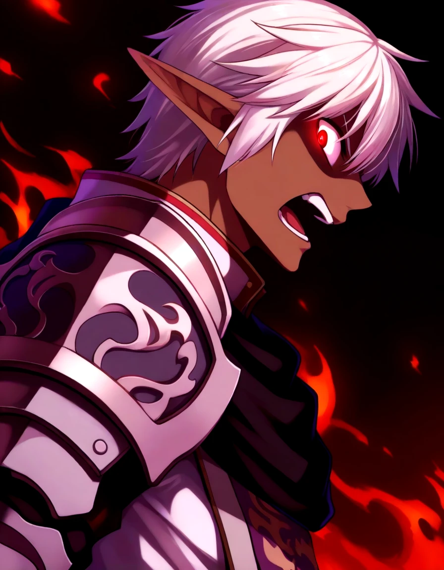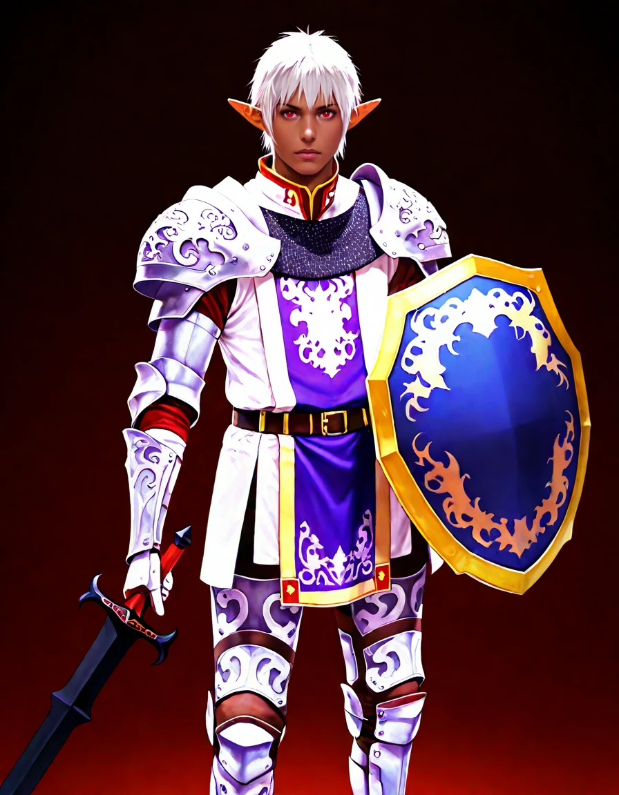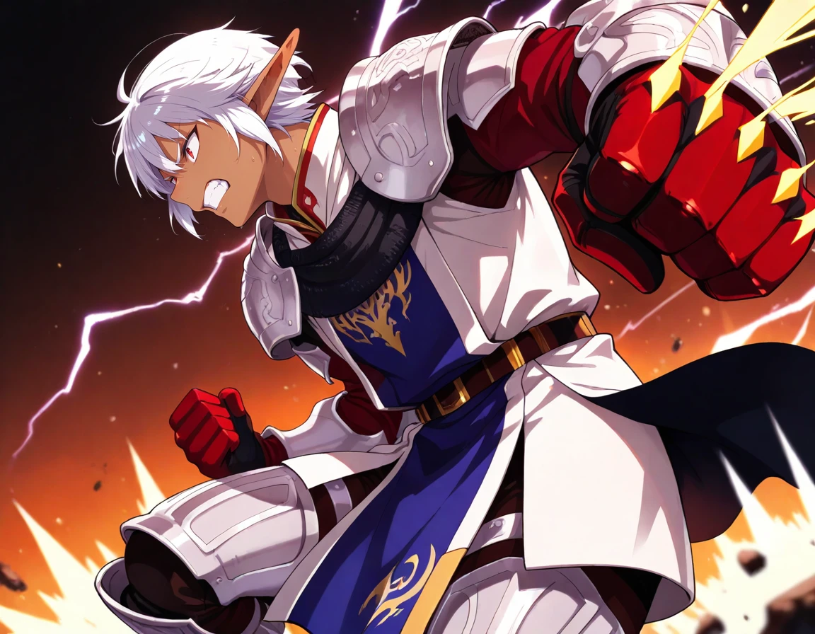 1boy,white hair,pointy ears,red eyes,dark skin,armor ,greaves, tabard,pauldrons,gauntlets,