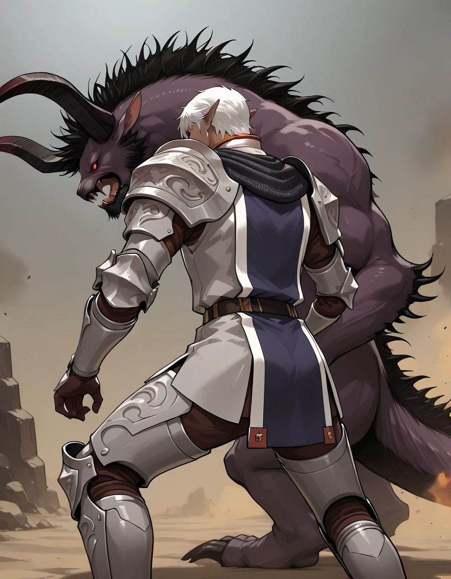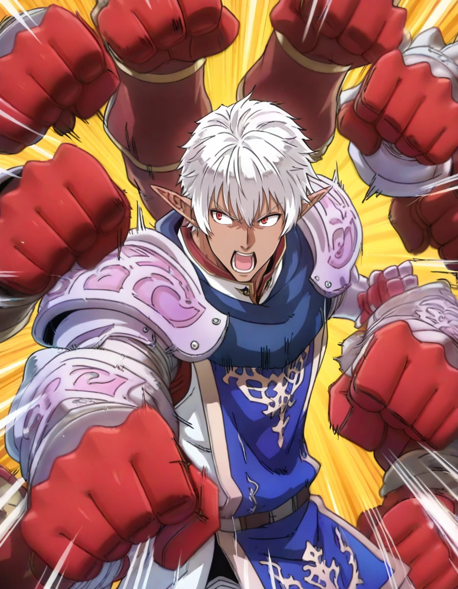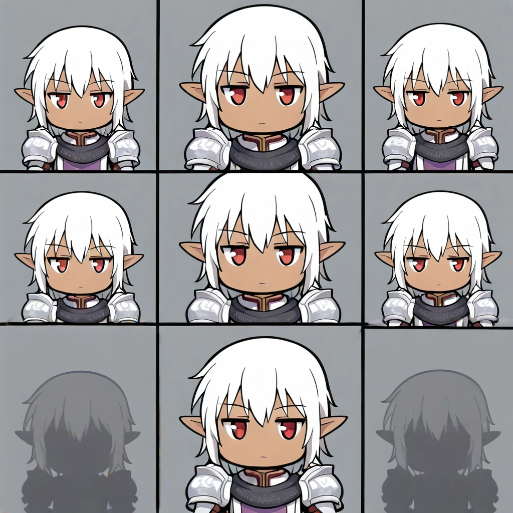 Recommended Prompts: FF11buront,1boy,white hair,pointy ears,red eyes,dark skin,armor ,greaves, tabard,pauldrons,gauntlets,