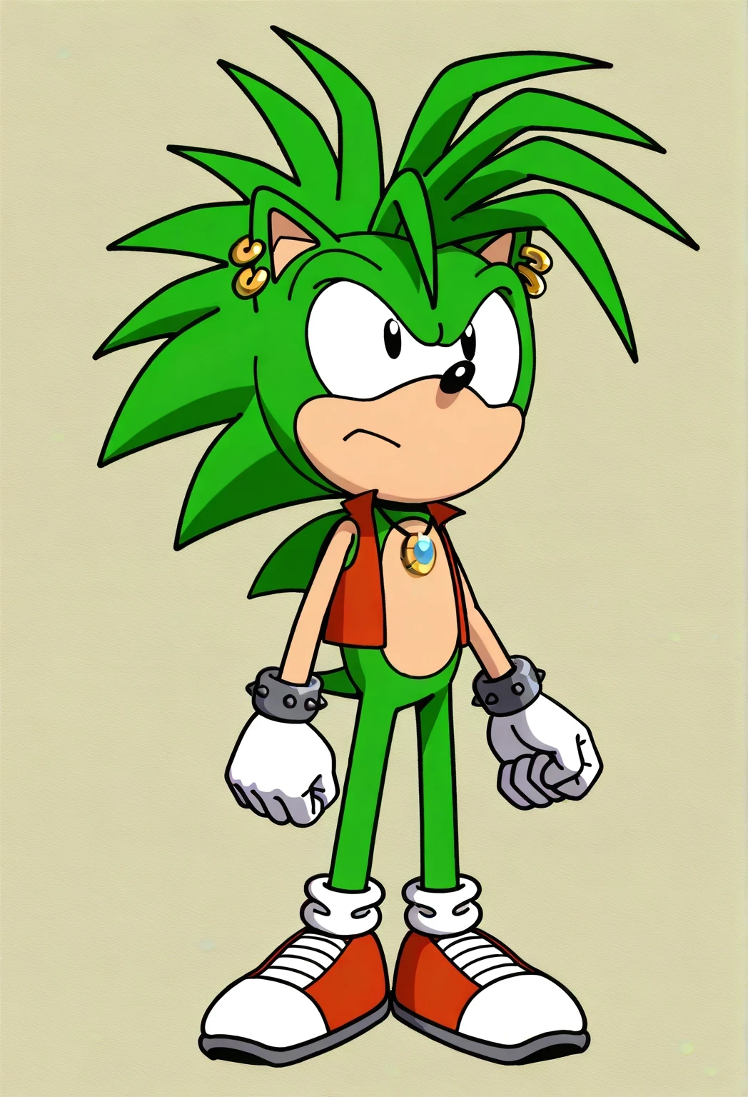 ManicSU, 1boy, spiky wild green hair, green fur, red sneakers, green pants, red jacket, white gloves, necklace featuring a circular gem, golden earrings, black eyes, sonic the hedgehog, short