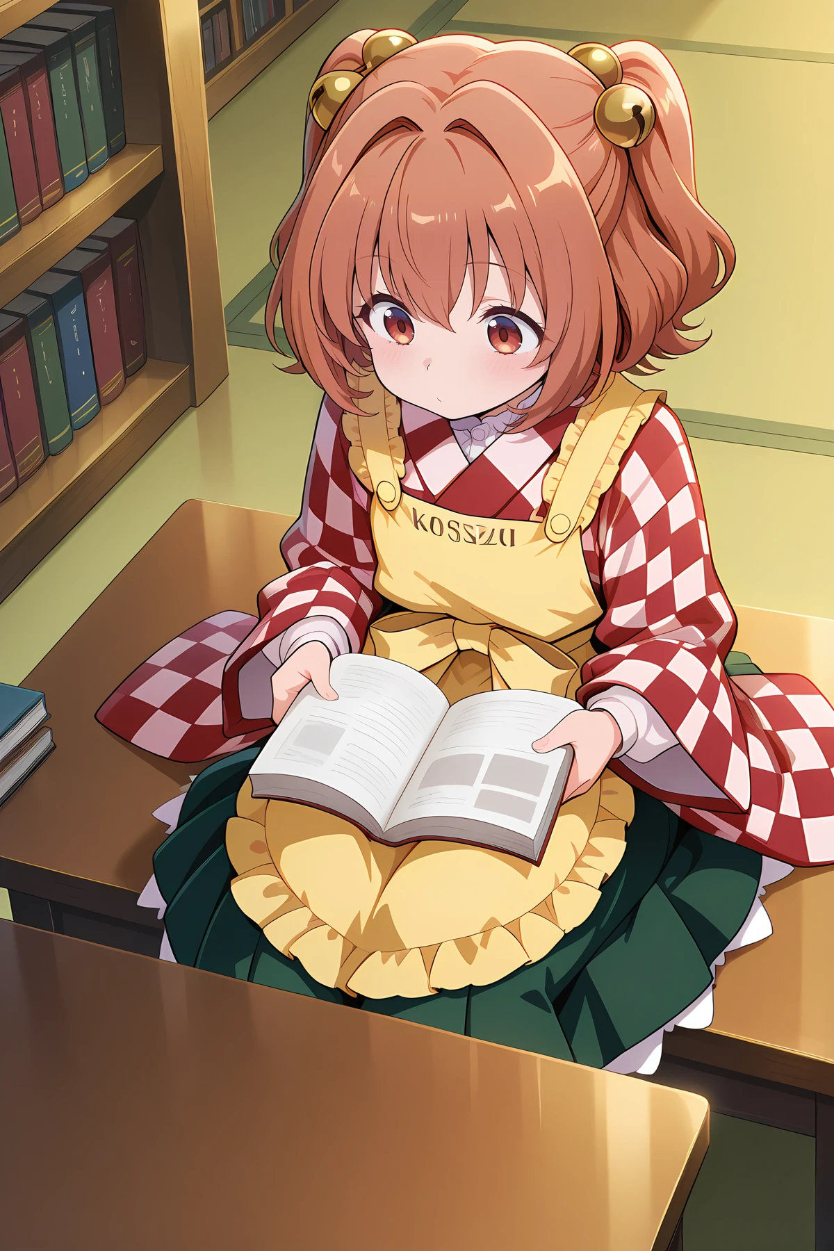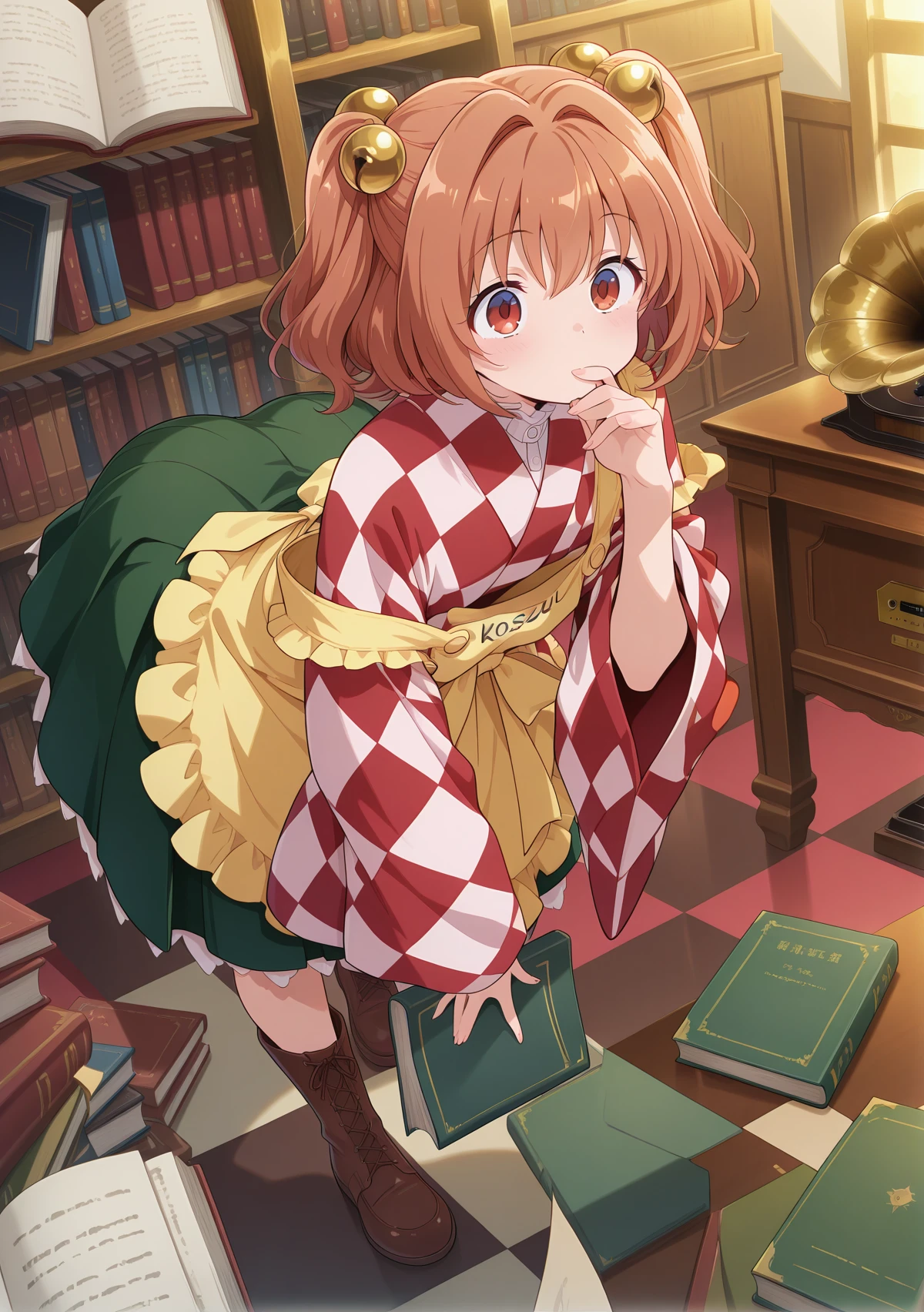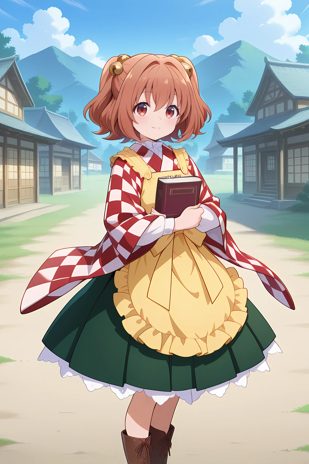 motoori kosuzu, 1girl, solo, brown eyes, brown hair, twintails, short hair,bell, checkered kimono, wide sleeves, yellow apron, green skirt, brown boots, Alternative :