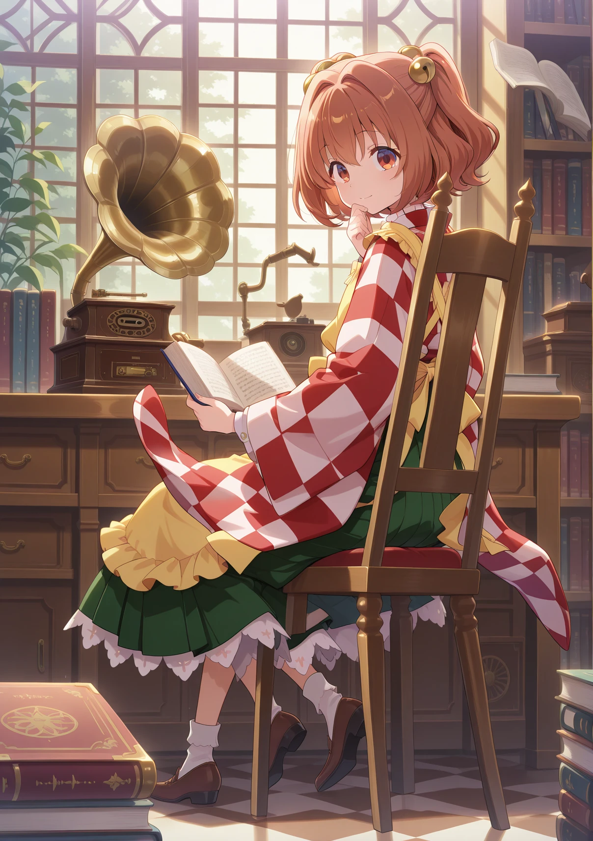 bell, checkered kimono, wide sleeves, yellow apron, green skirt, brown boots,