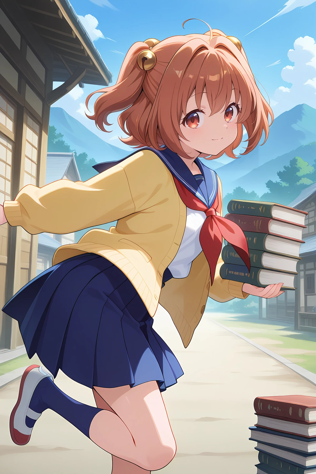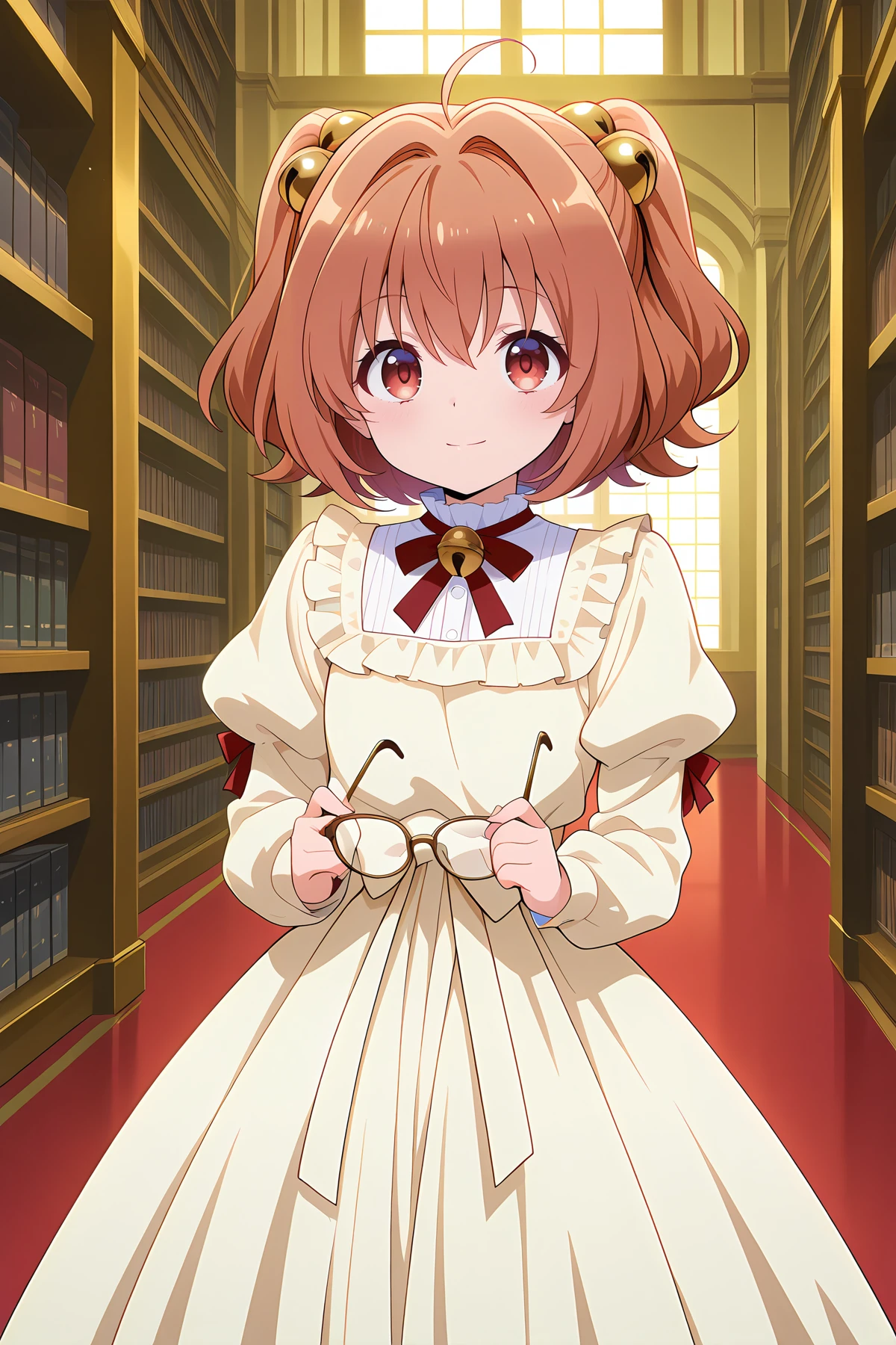 motoori kosuzu, 1girl, solo, brown eyes, brown hair, twintails, short hair, bell, ahoge, bell, blue sailor collar, blue skirt, blue socks, book stack, yellow cardigan, holding book, sweater, open cardigan, long sleeves, white shirt, pleated skirt, red neckerchief, blue sailor collar, uwabaki, motoori kosuzu, 1girl, solo, brown eyes, brown hair, twintails, short hair, motoori kosuzu \(the white book of gossip\), ahoge, twin drills, drill hair, two side up, alternate costume, bell, white dress, frilled dress, juliet sleeves, long dress, long sleeves, puffy sleeves, unworn eyewear, holding removed eyewear, Optionnal :