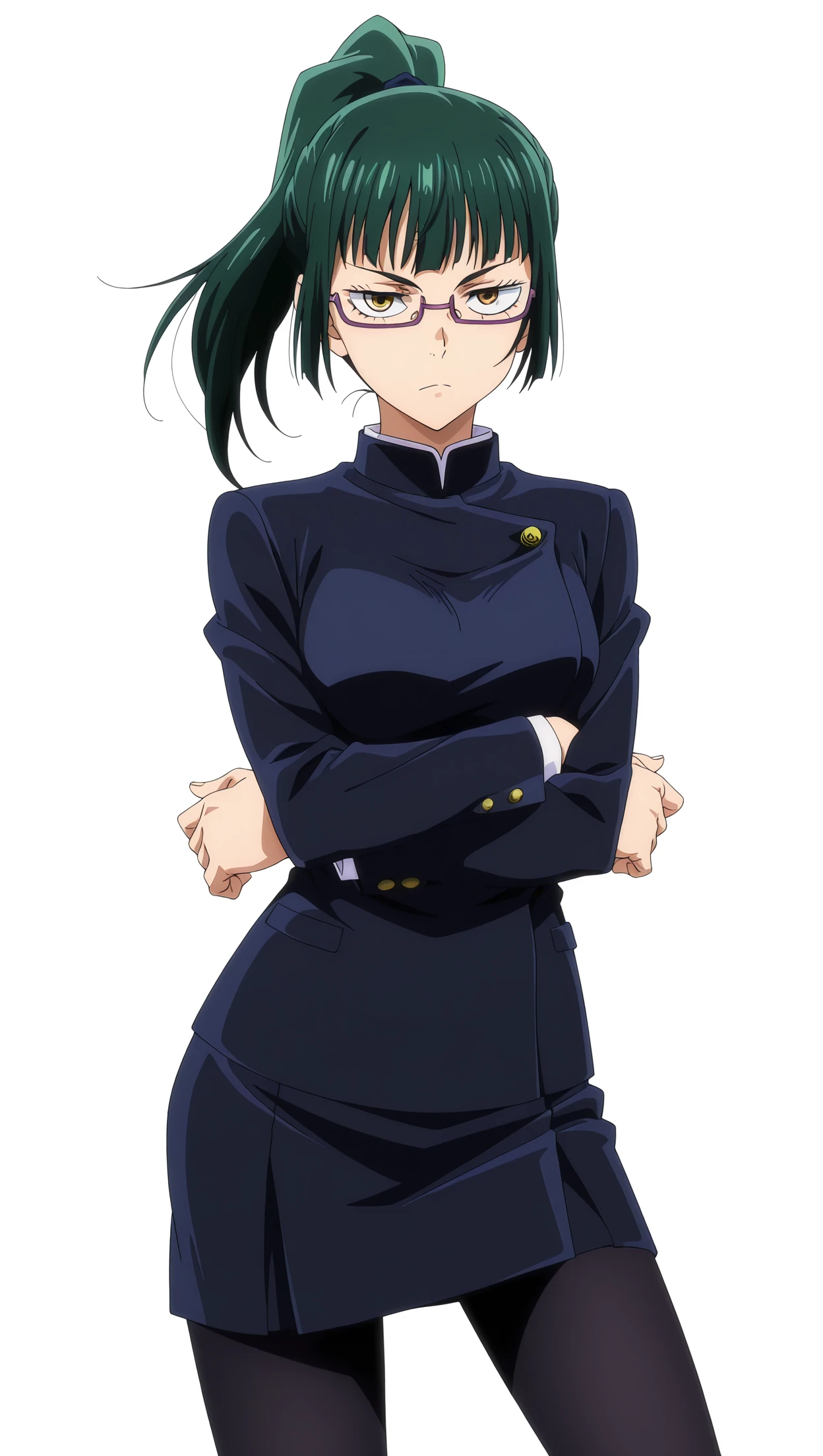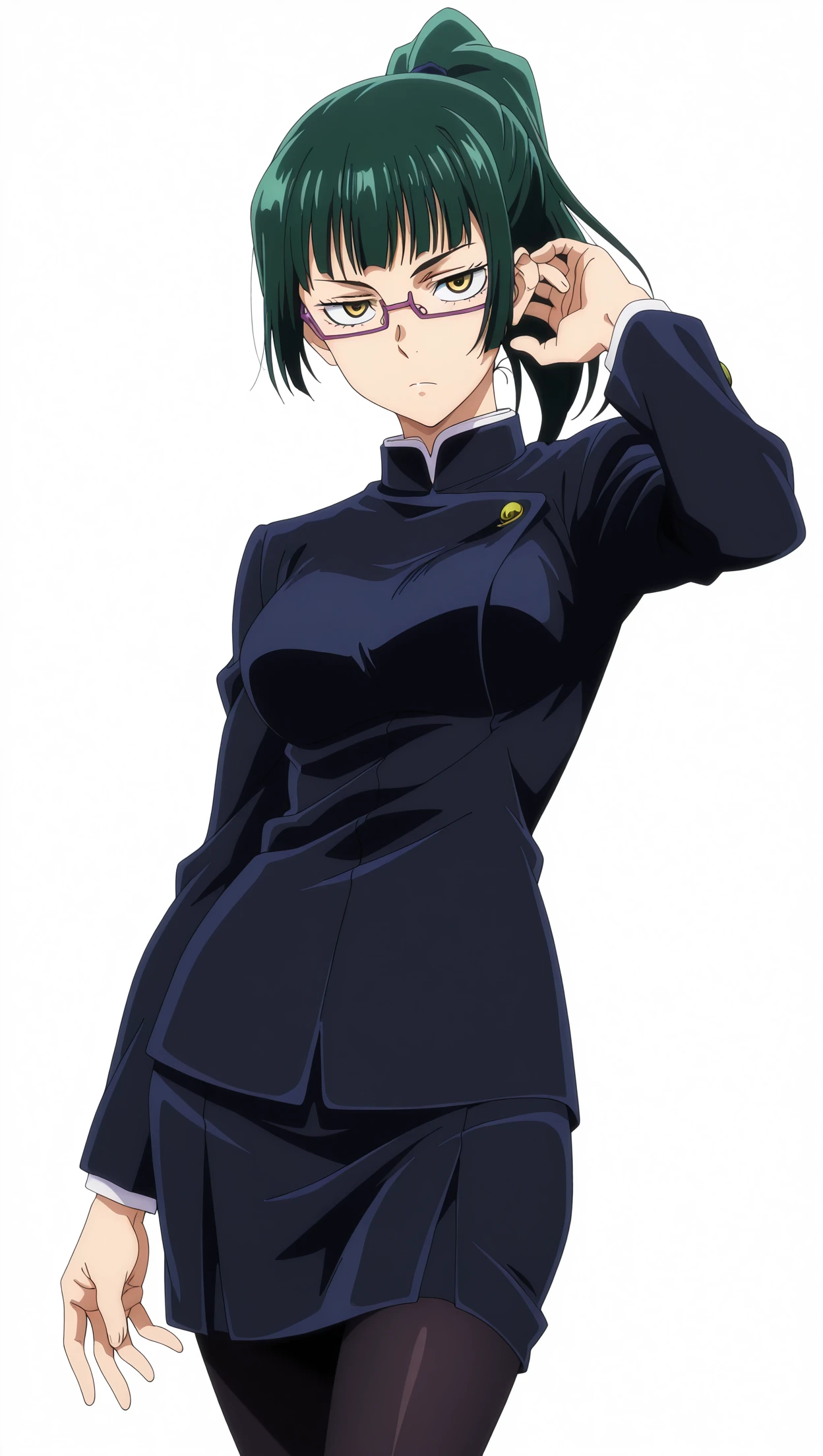 maki, 1girl, long hair, ponytail, green hair, yellow eyes, medium breasts, pantyhose, glasses, school uniform, gakuran