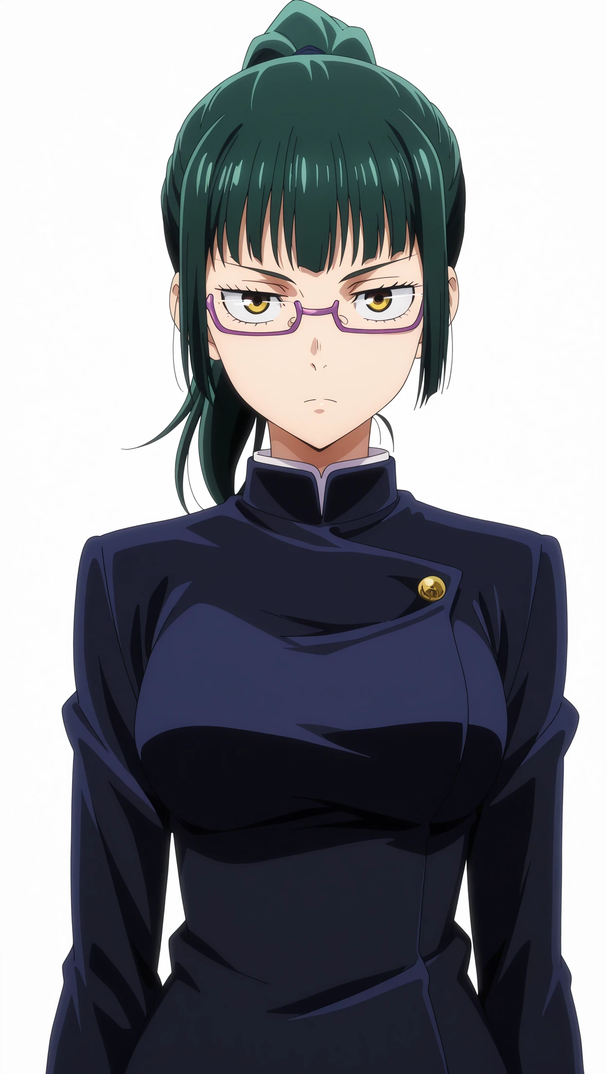 anime coloring, masterpiece, best quality, amazing quality, maki, 1girl, long hair, ponytail, green hair, yellow eyes, medium breasts, pantyhose, glasses, school uniform, gakuran, solo, pose, standing, looking at viewer, white background, simple background⚙️ Generation Settings