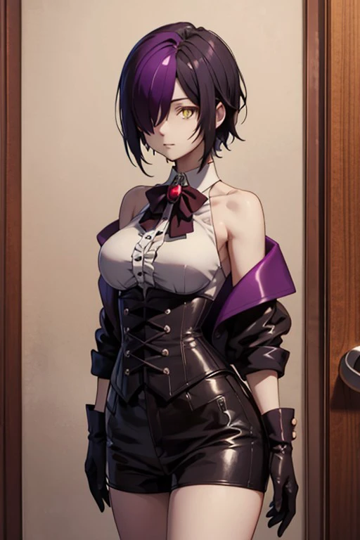 her clothes : shirt, white shirt, bare shoulders, sleeveless, sleeveless shirt, collared shirt, bow, bowtie, black jacket, center frills, brooch, frills, frilled shirt, gloves, black gloves, shorts, black shorts, short shorts, purple bow, corset
