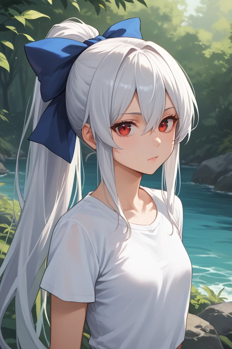 MeruMeru, 1girl, long hair, ponytail,high ponytail, sidelocks, white hair, very long hair,small breasts, navel, skinny, White skin, bare shoulders, red eyes , hair between eyes