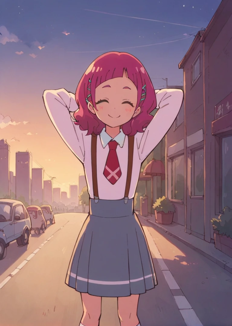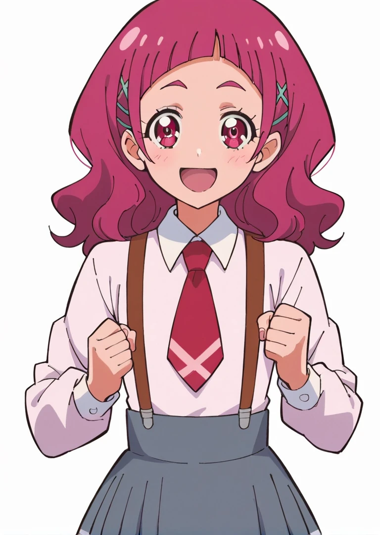 school uniform, shirt, red necktie, suspenders, grey skirt,