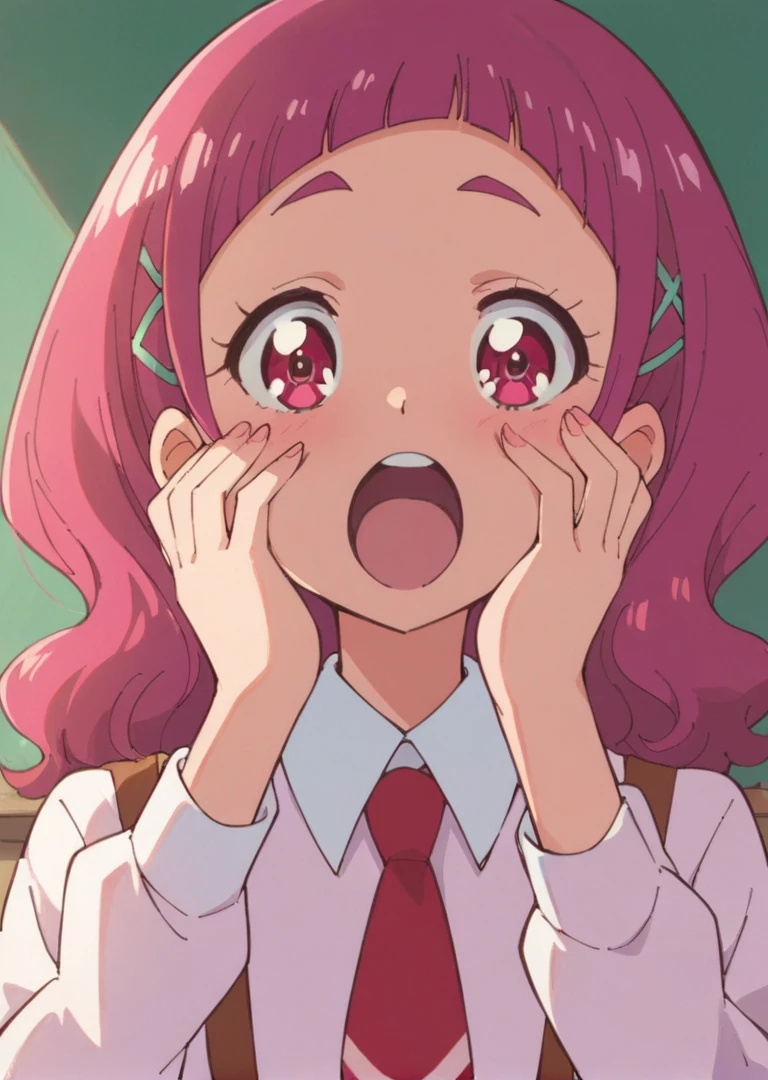 nono hana, pink eyes, pink hair, long hair, blunt bangs, hairclip, x hair ornament,