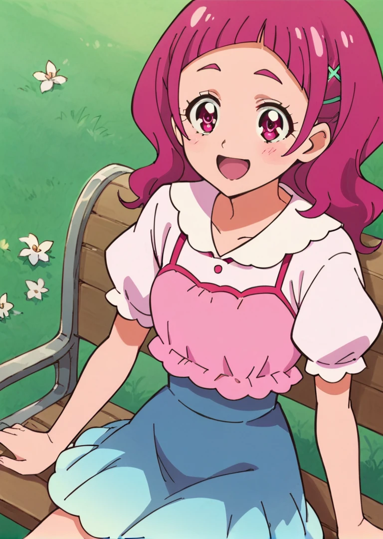 layered shirt, pink shirt, short puffy sleeves, layered skirt, blue skirt