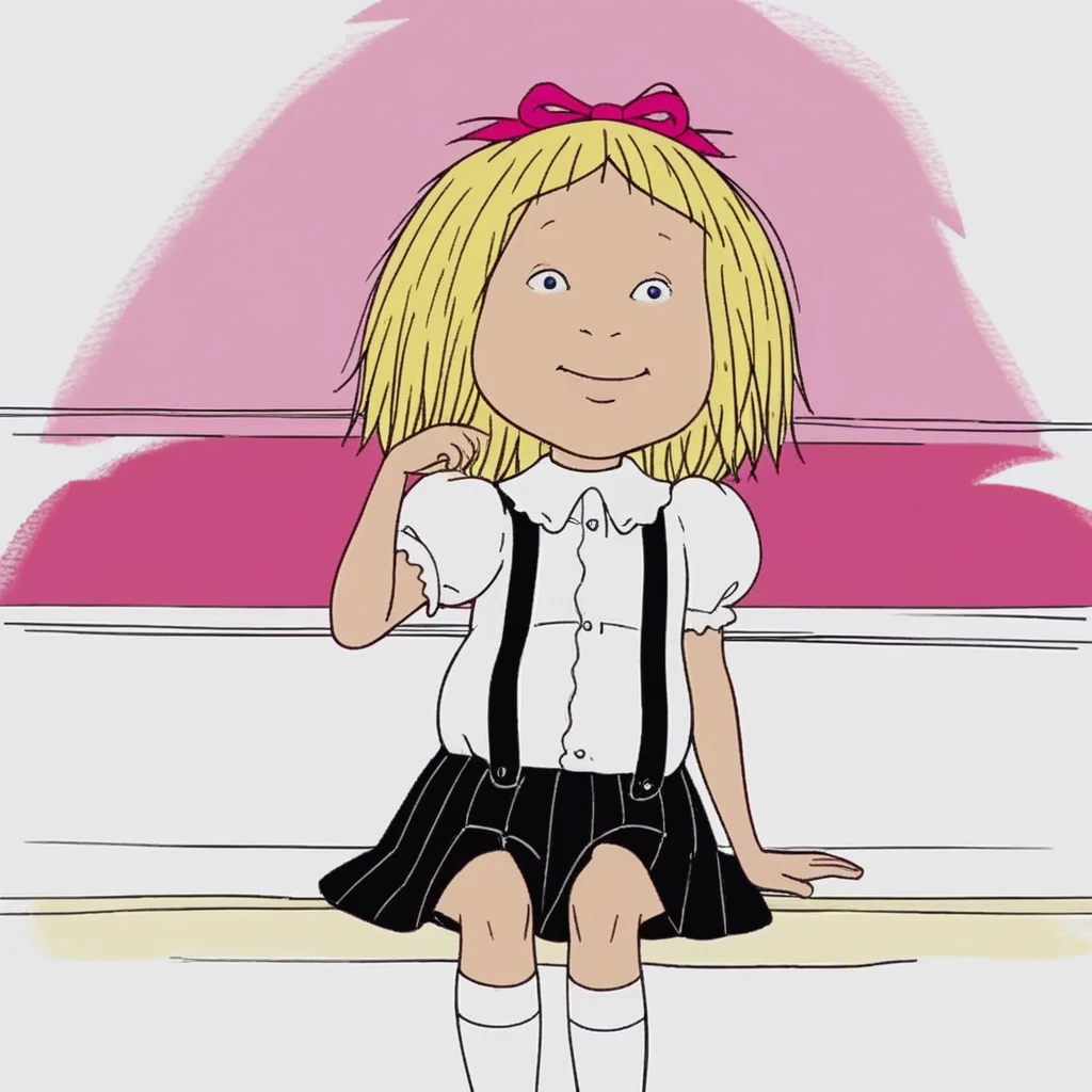 eloise, blonde hair, short hair, ribbon, suspenders, skirt