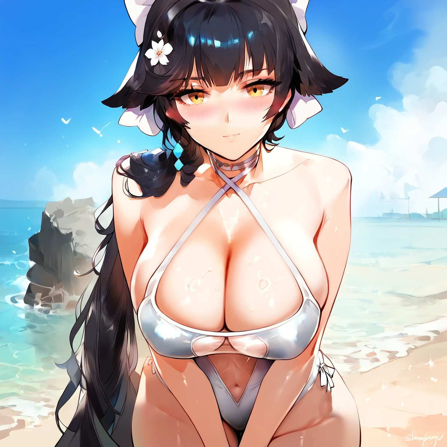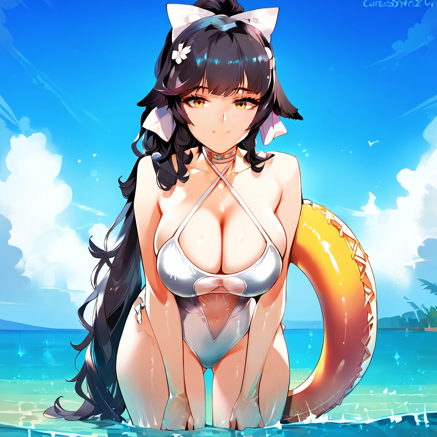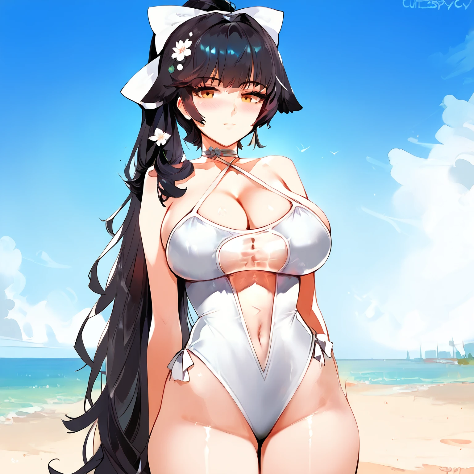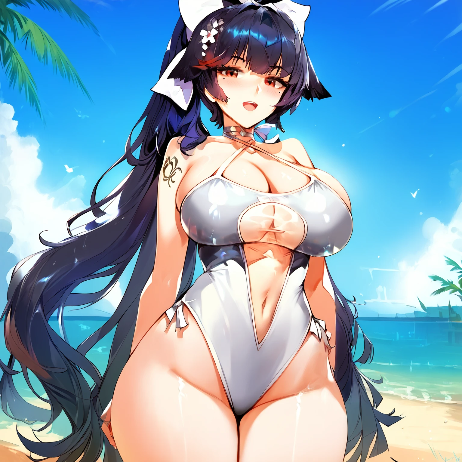 Beach Rhapsody: takaobkn, breasts, official alternate costume, swimsuit, one-piece swimsuit, white one-piece swimsuit, long hair, black hair, large breasts, ponytail, bow, barefoot, halterneck, casual one-piece swimsuit, criss-cross halter, flower, cleavage, hair ornament, hair bow