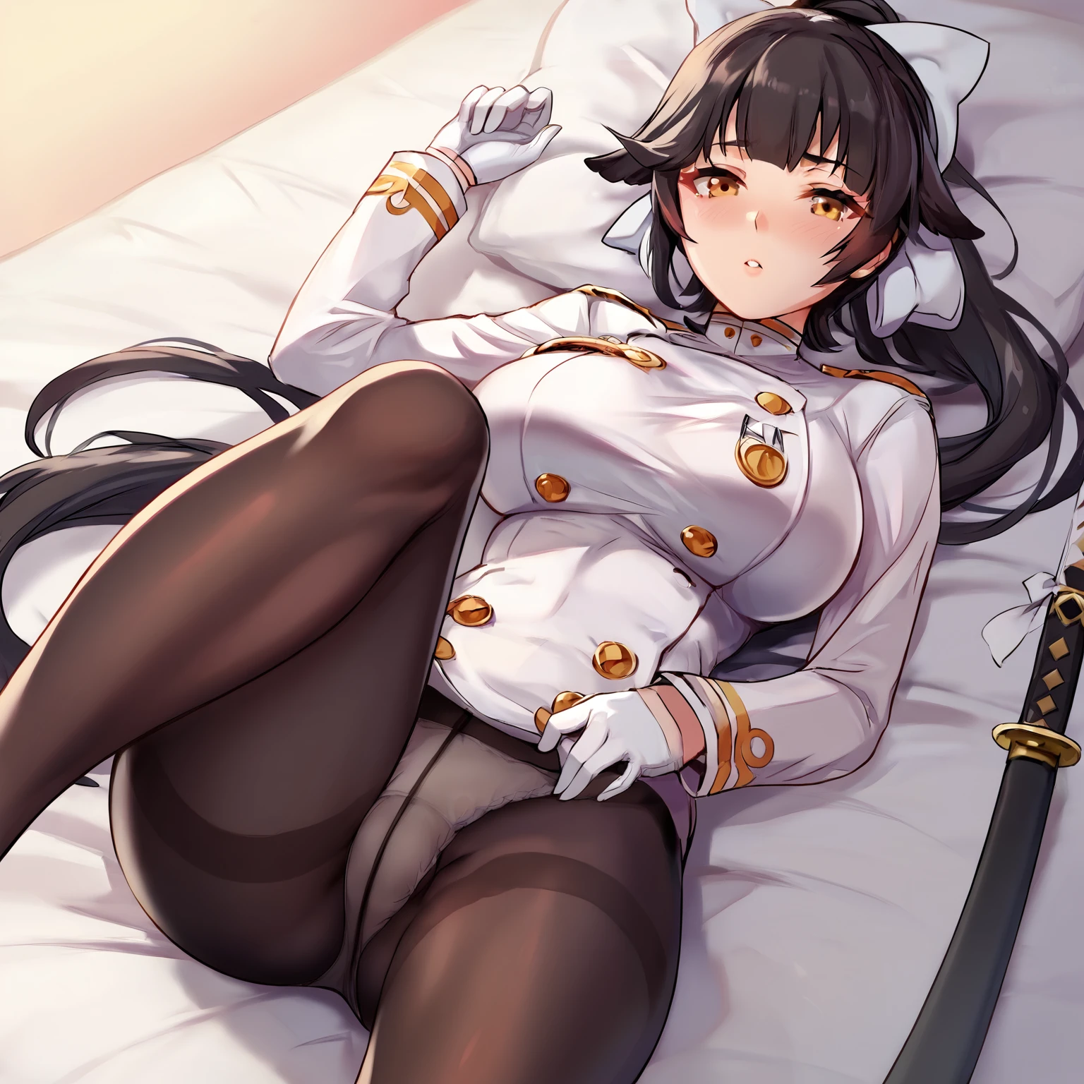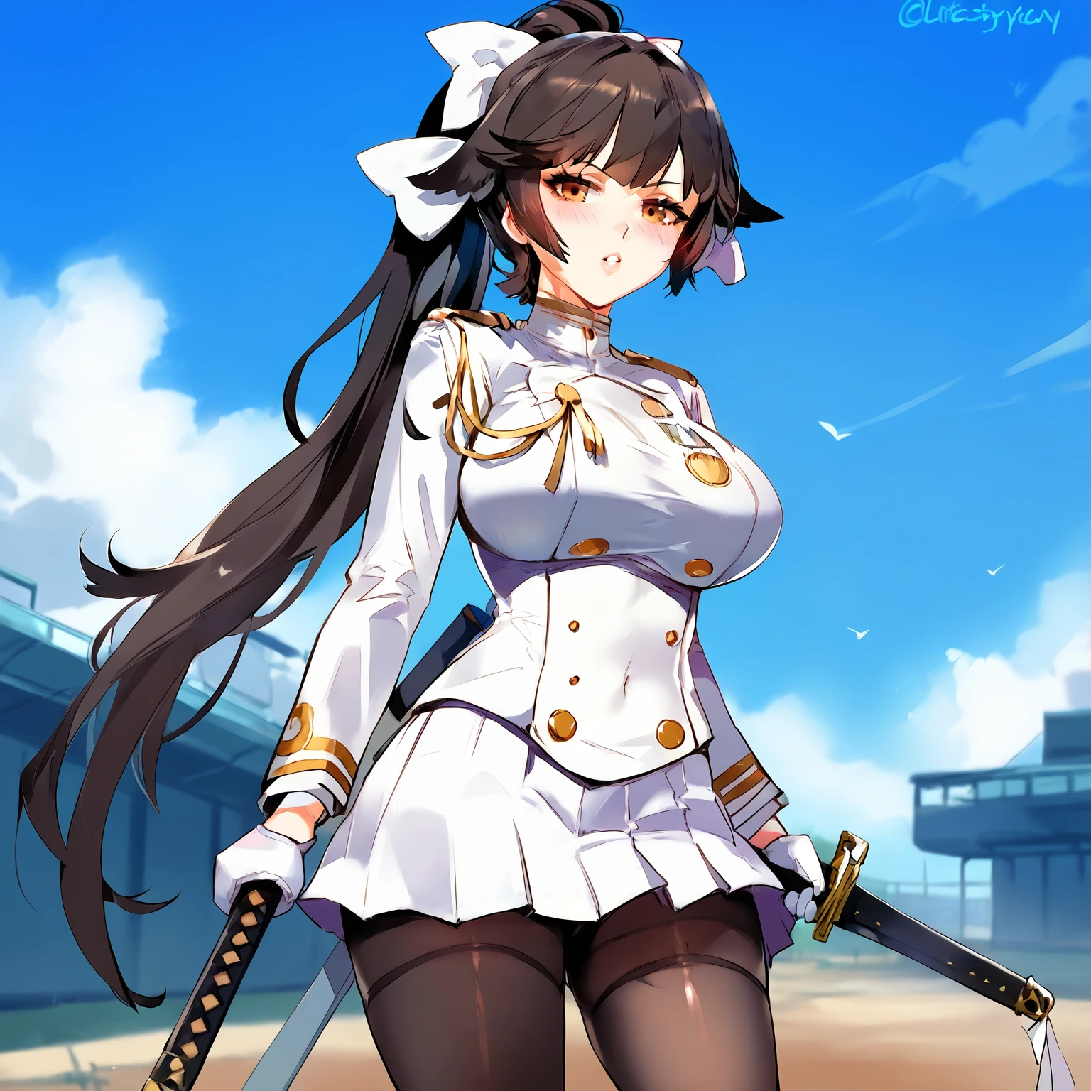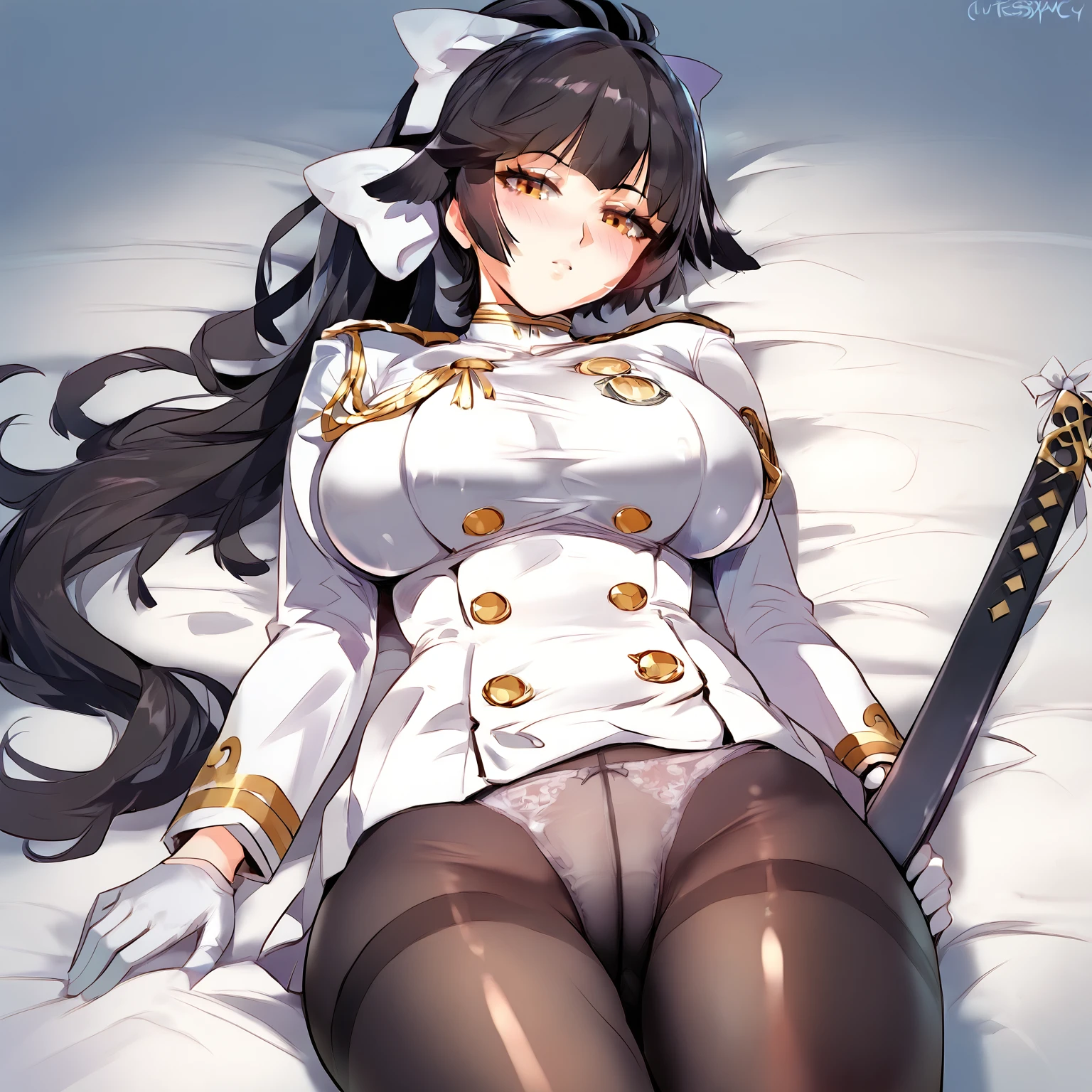 Default skin: takaodf, pantyhose, weapon, gloves, solo, black hair, skirt, loafers, long hair, thighband pantyhose, sword, uniform, ponytail, military, breasts, full body, black footwear, military uniform, white gloves, pleated skirt, bow, panties, shoes, katana, panties under pantyhose, underwear, black pantyhose, yellow eyes
