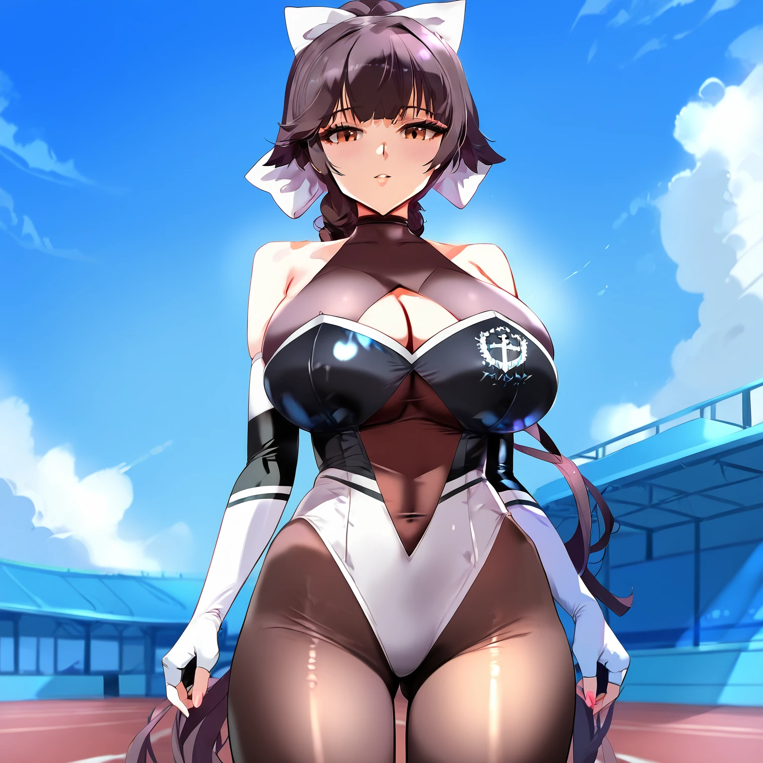 Full Throttle Charmer: takaorq, race queen, official alternate costume, breasts, bodystocking, gloves, solo, long hair, umbrella, large breasts, elbow gloves, black hair, clothing cutout, fingerless gloves, leotard, ponytail, black hair, pantyhose, cleavage cutout, bare shoulders, high heels, bodysuit