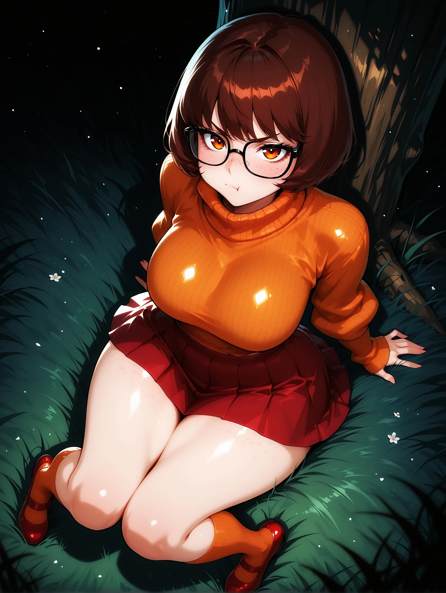 Velma Prompts : 1girl, freckles, short hair, brown hair, brown eyes, bangs, bob cut, wide ????, thick thighs