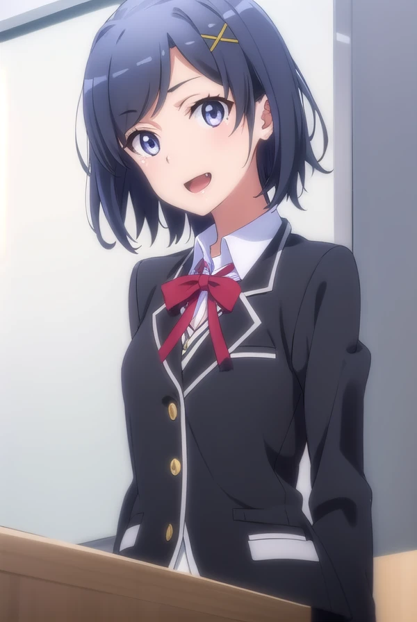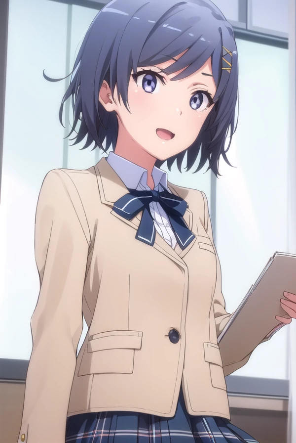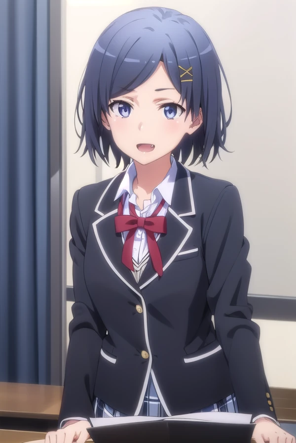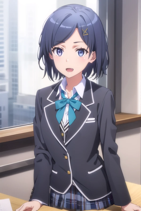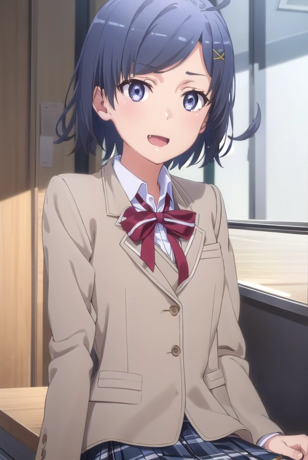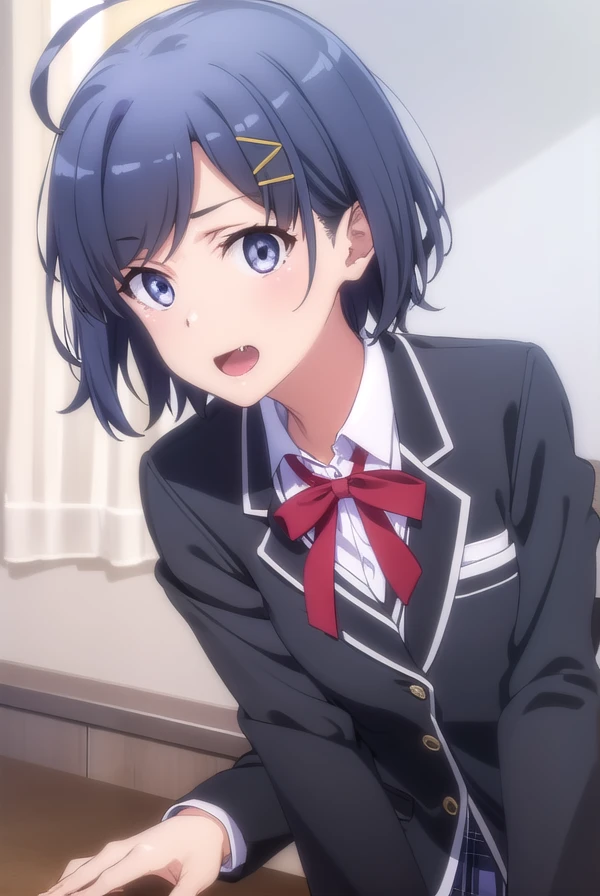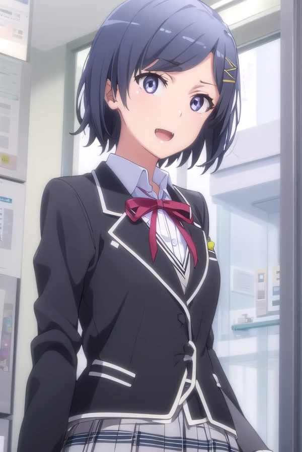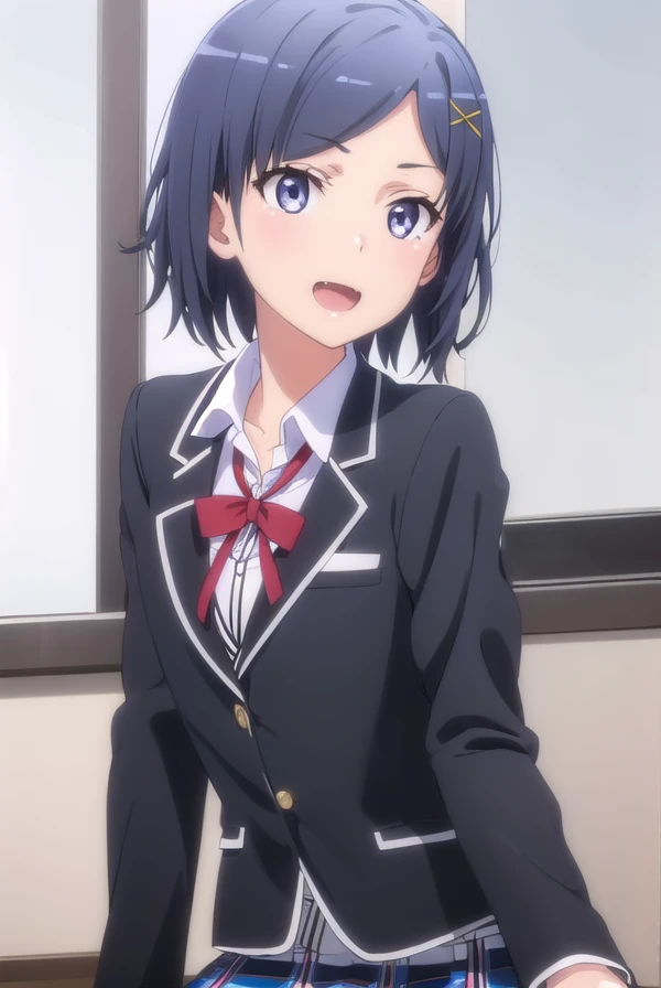 komachi hikigaya, short hair, black hair, hair ornament, ahoge, hairclip, x hair ornament, (purple eyes:1.1),