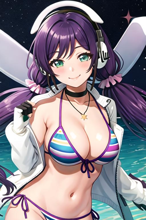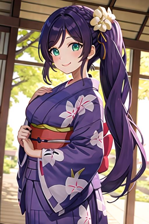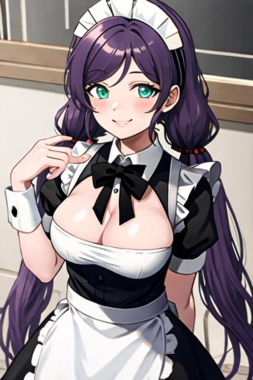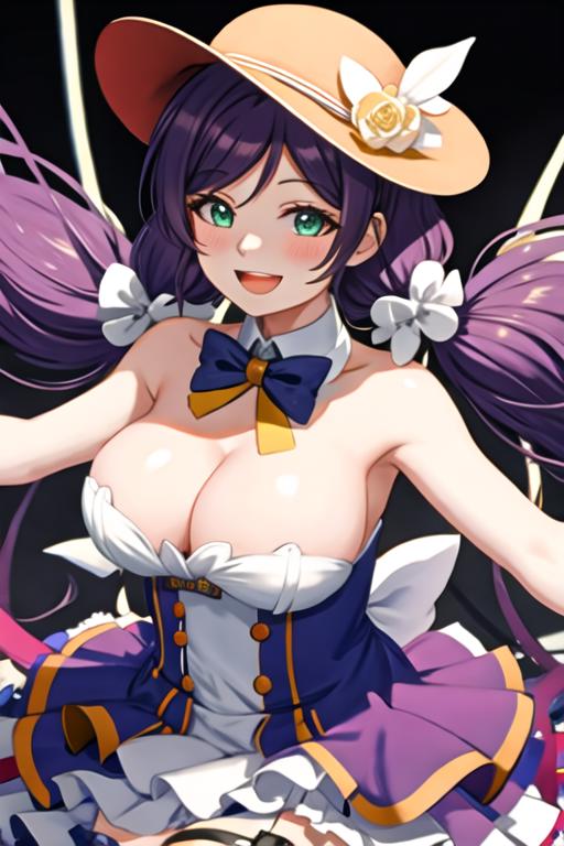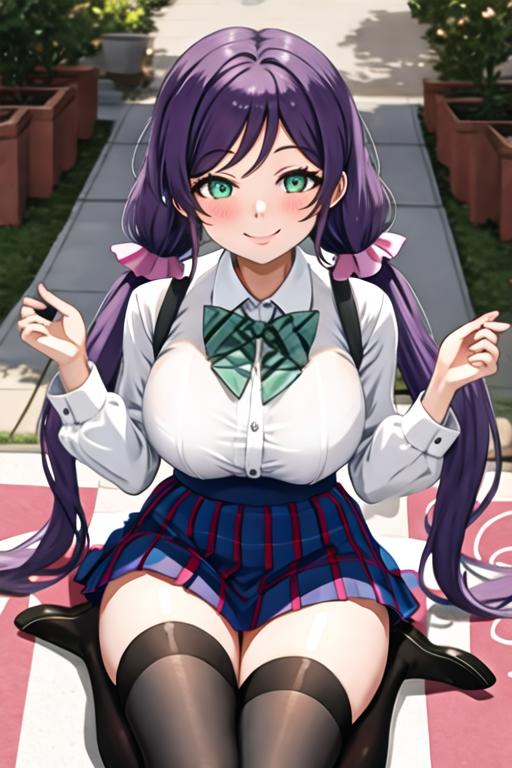 The trigger word is toujou_nozomi_lovelive, and the recommended tags are best quality, masterpiece, highres, solo, {toujou_nozomi_lovelive:1.15}, purple_hair, long_hair, green_eyes, breasts, smile, blush, twintails, large_breasts, hair_ornament, low_twintails.