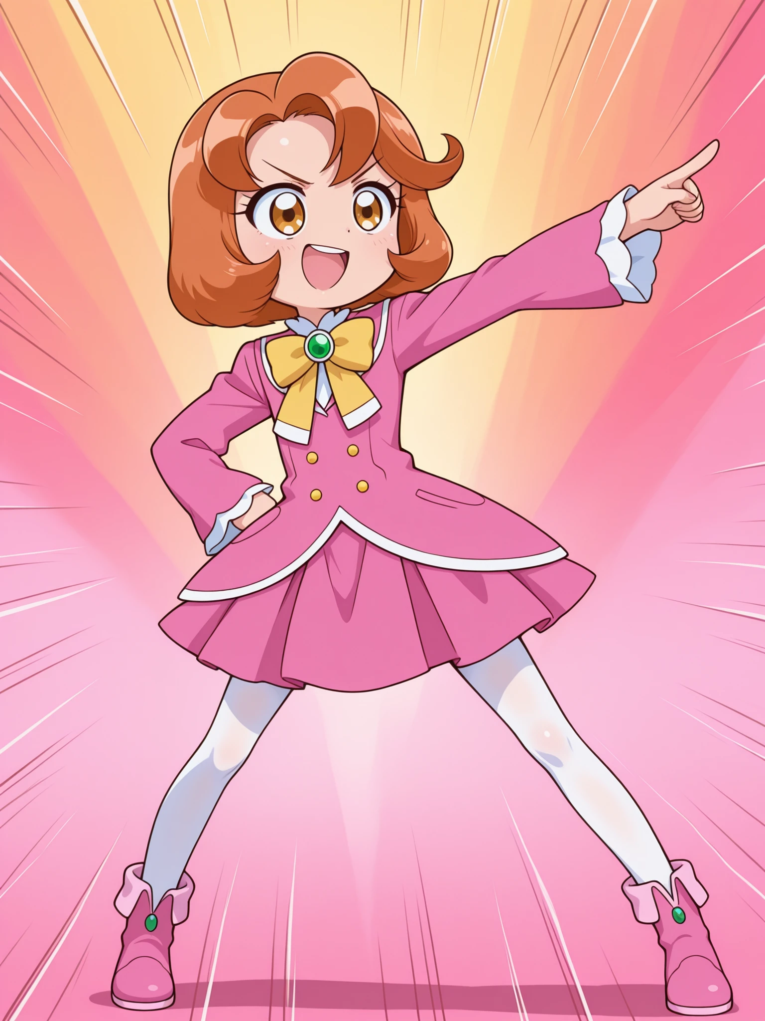 <lora:carlagyu_illustrious:1>, carlagyu, retro artstyle, 1990s \(style\), school uniform, brown hair, orange hair, short hair, flipped hair, bobcut, brown eyes, orange eyes, yellow eyes, pink jacket, pink blazer, yellow buttons, sleeves past wrists, frilled sleeves, yellow bow, bowtie, green brooch, green gem, pink skirt, pleated skirt, white pantyhose, pink boots, high heels, ankle boots, green jewelry