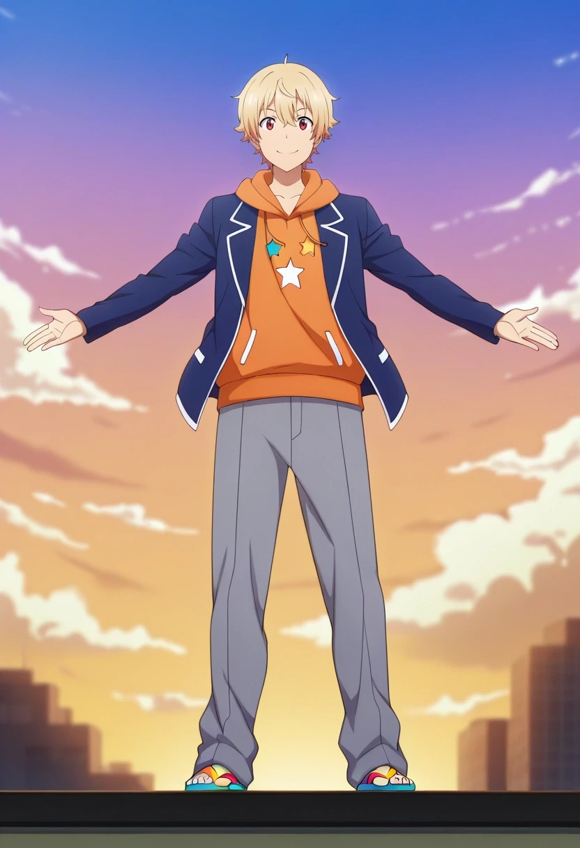 blue jacket, orange hoodie, open jacket, grey pants