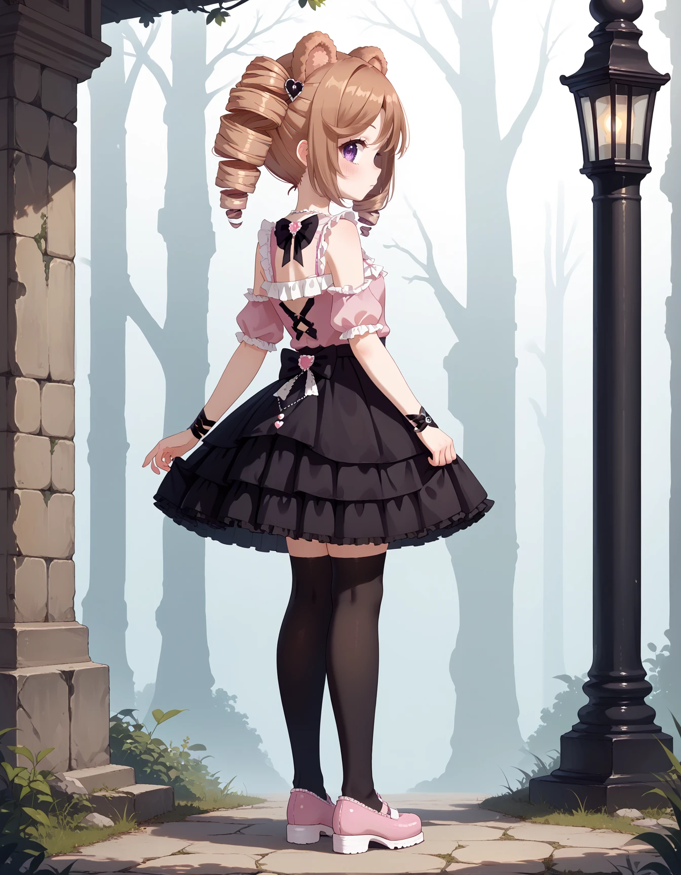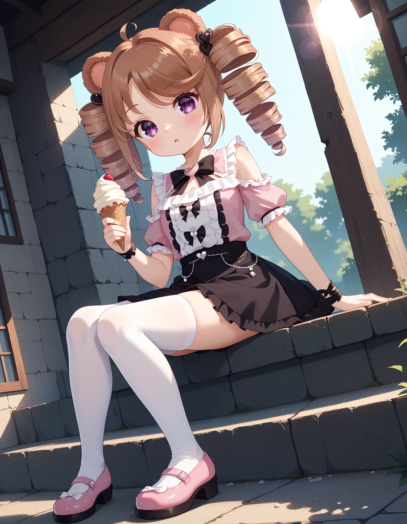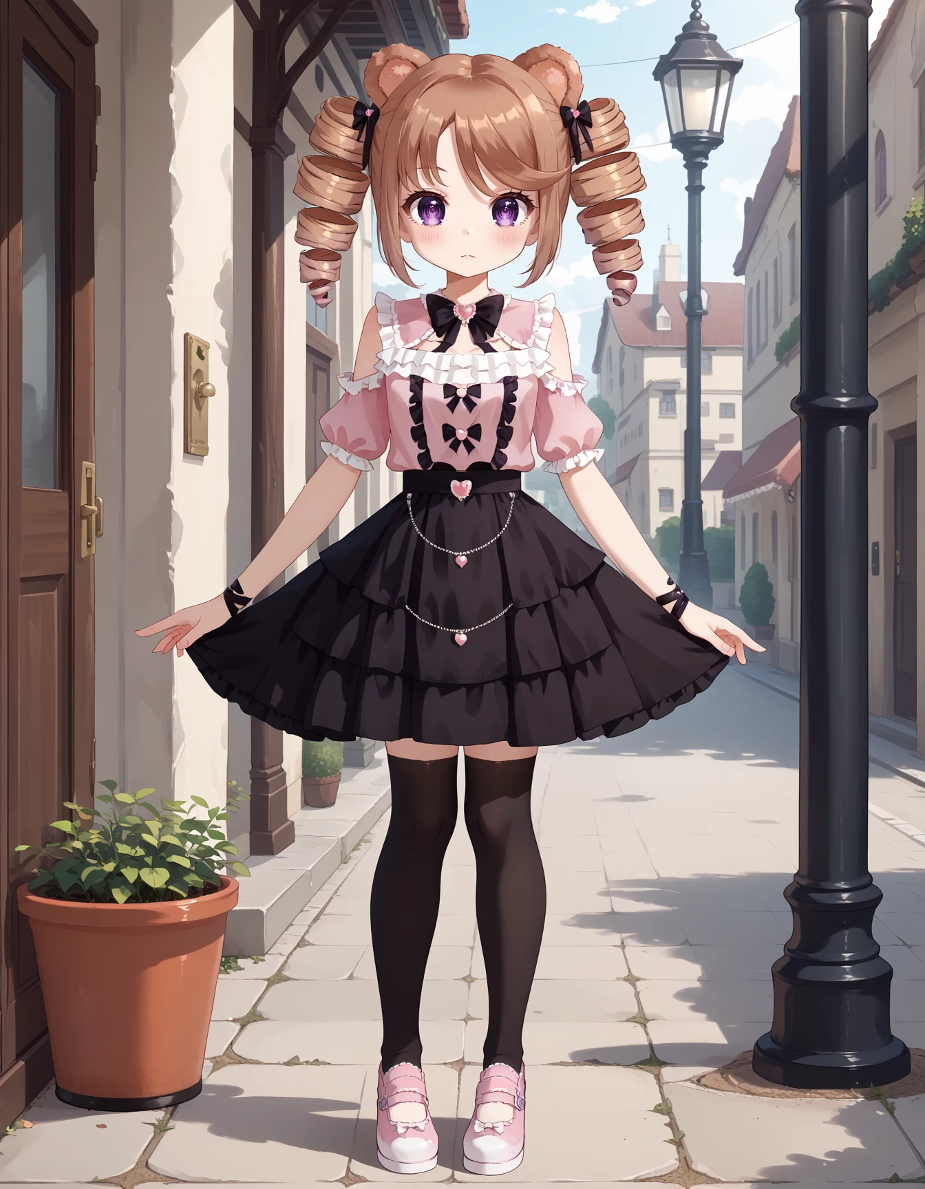 drill hair, pink blouse, detached sleeves, frills, black skirt, bracelet, thighhighs, pink shoes, mary janes, jewelry, hair ornament
