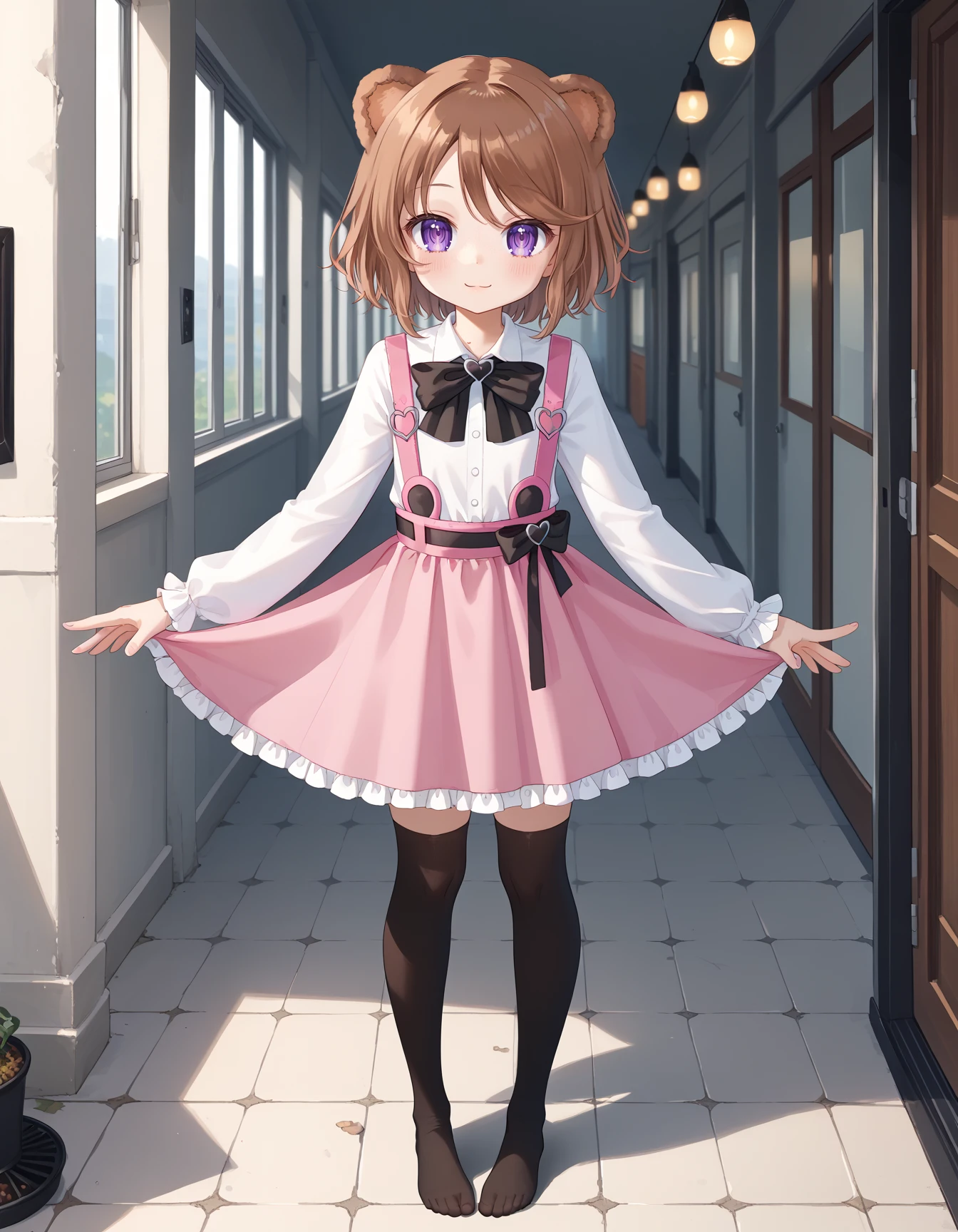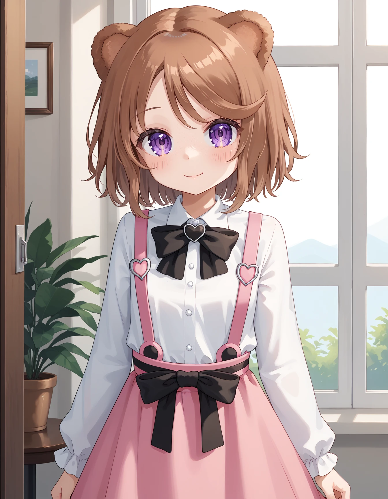 medium hair, collared shirt, long sleeves, suspenders, pink dress, black bow,