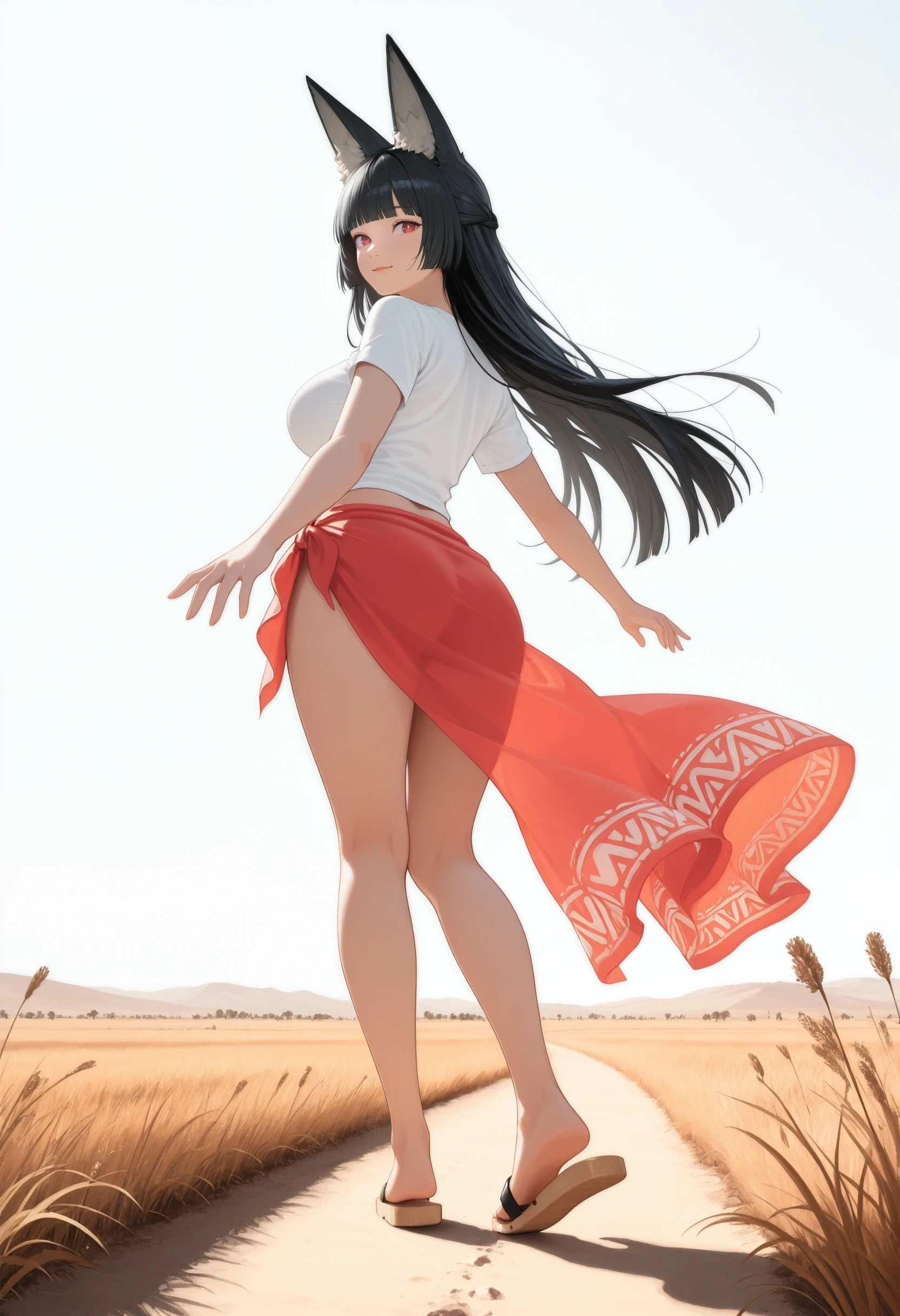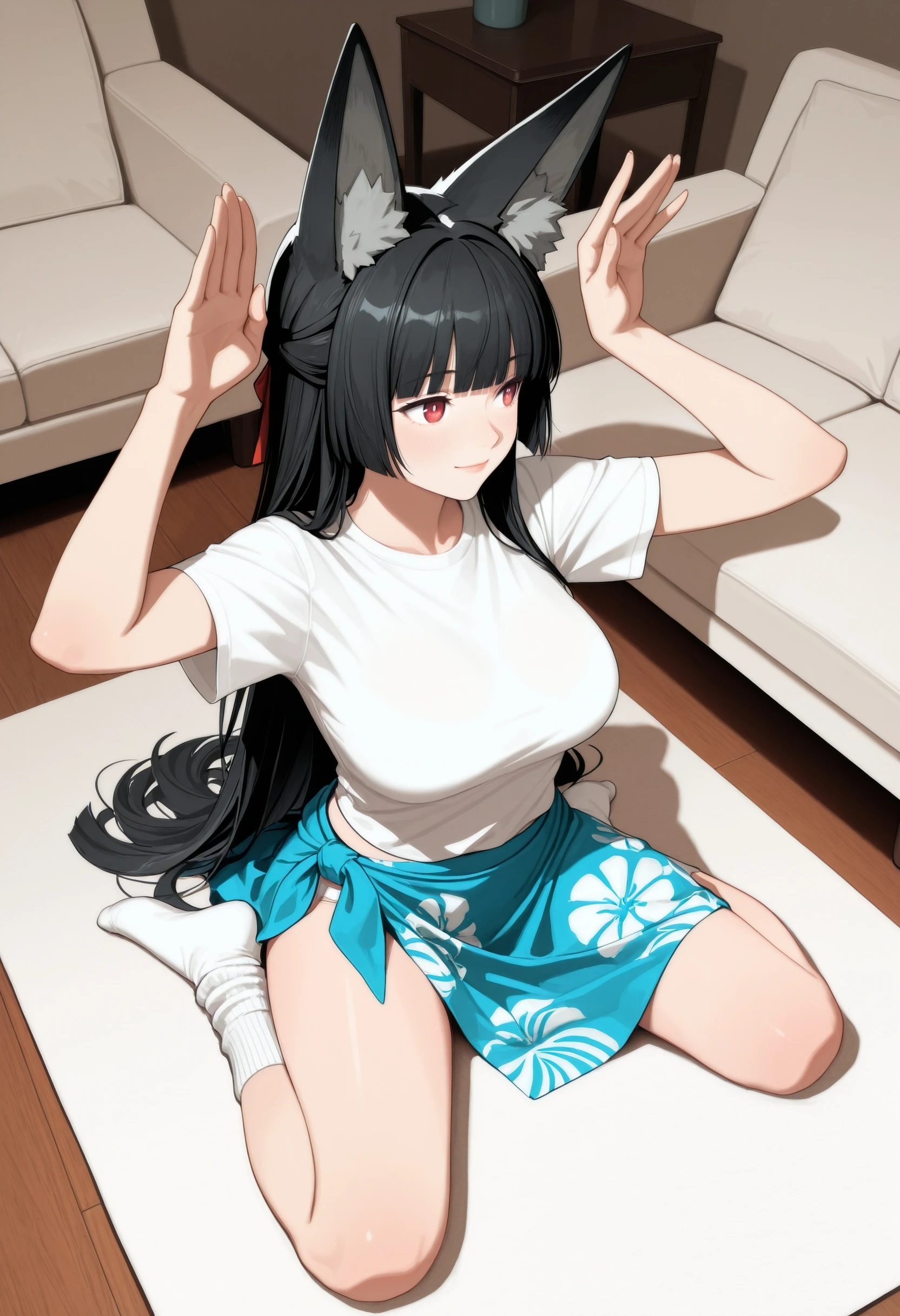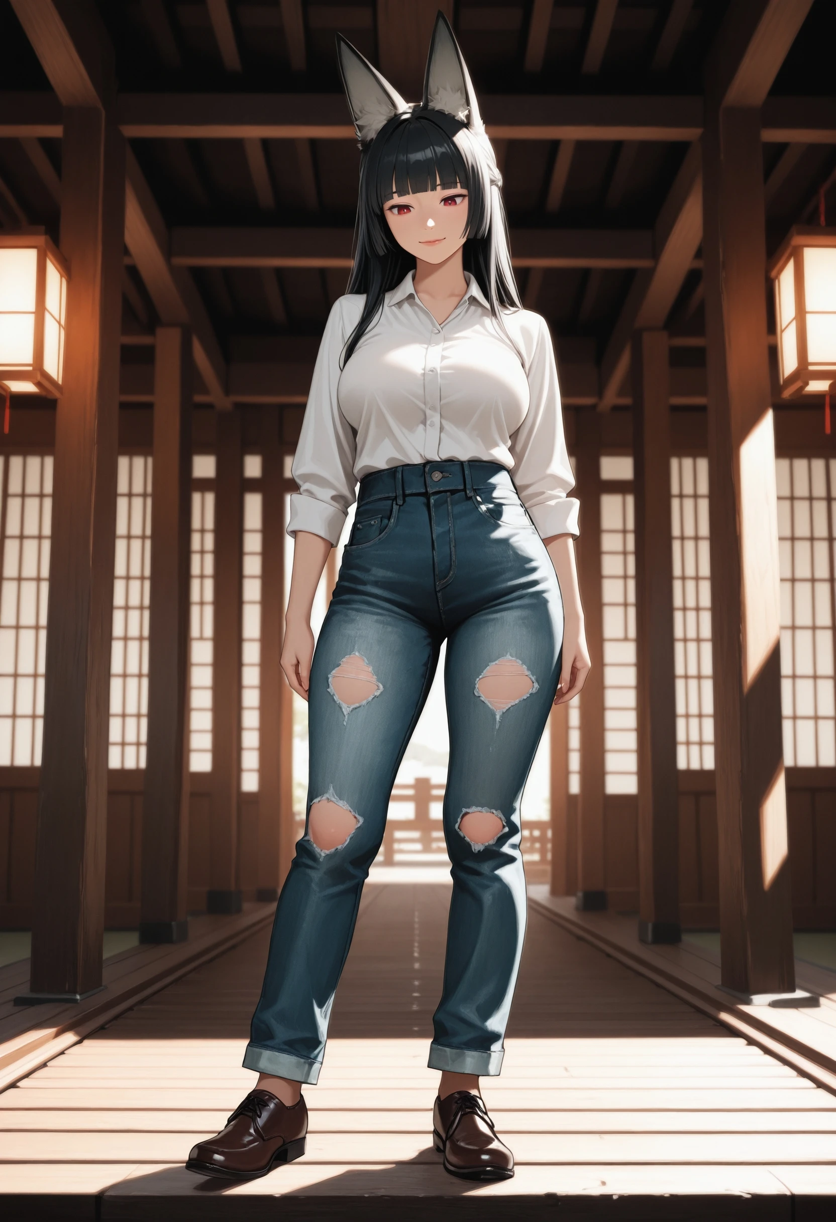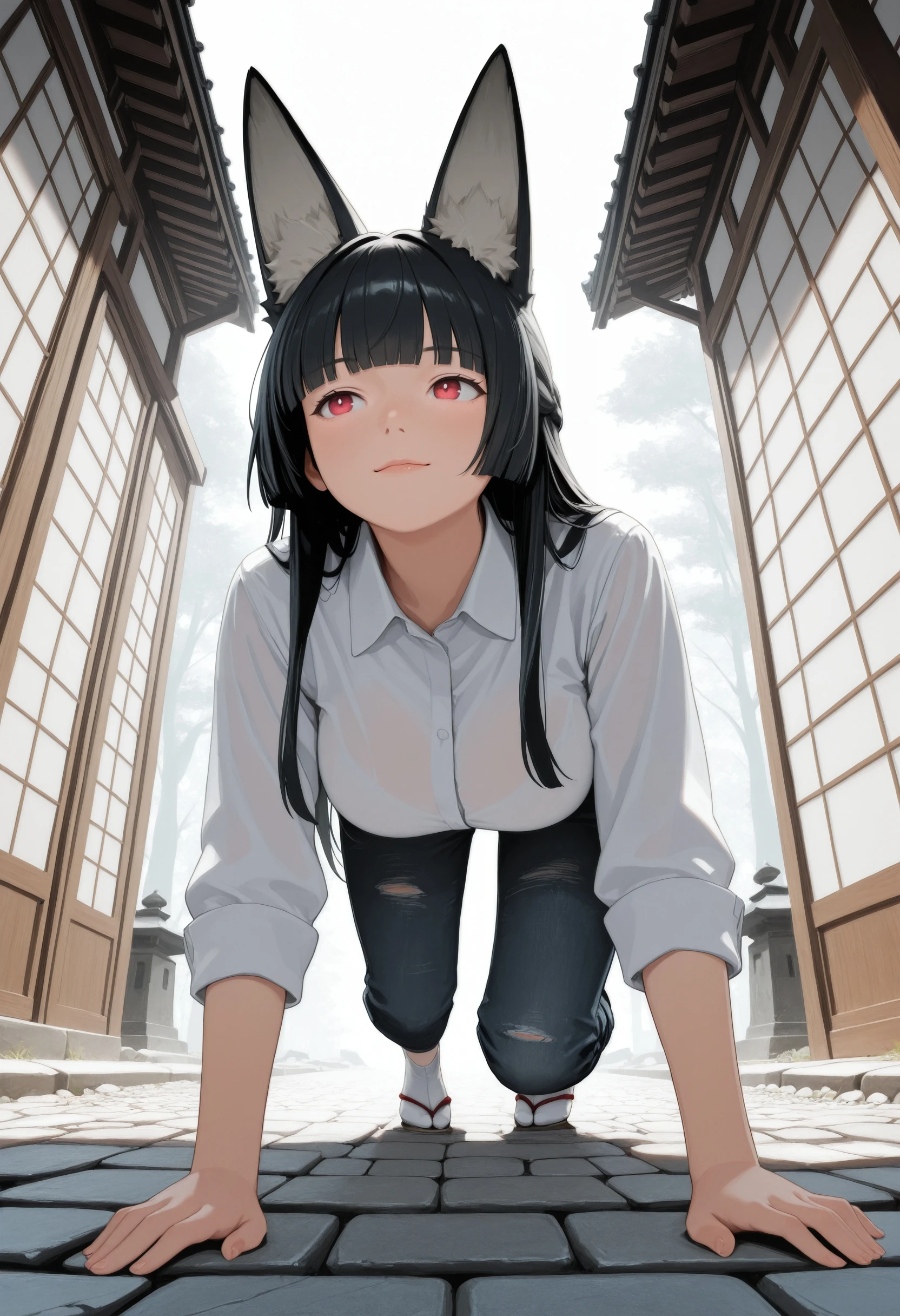 (Positive Prompts) zmiyabi, fox girl, fox ears, animal ear fluff, large , sidelocks, blunt bangs, black hair, long hair, center-flap bangs, red eyes,