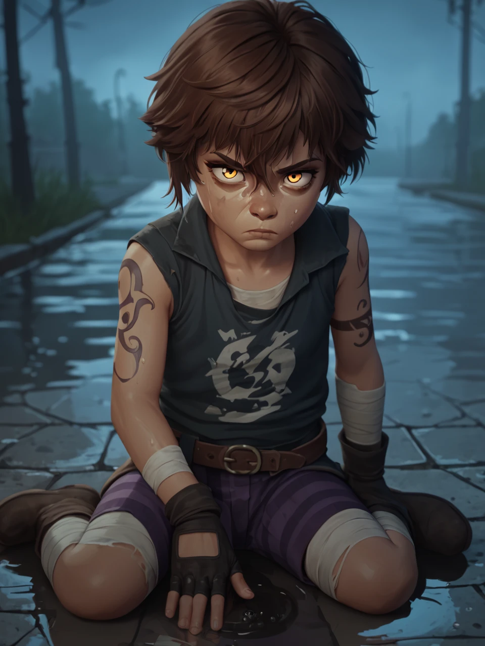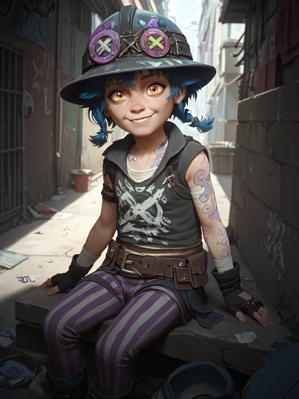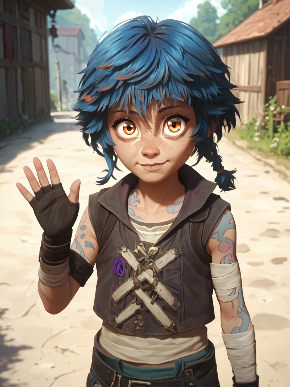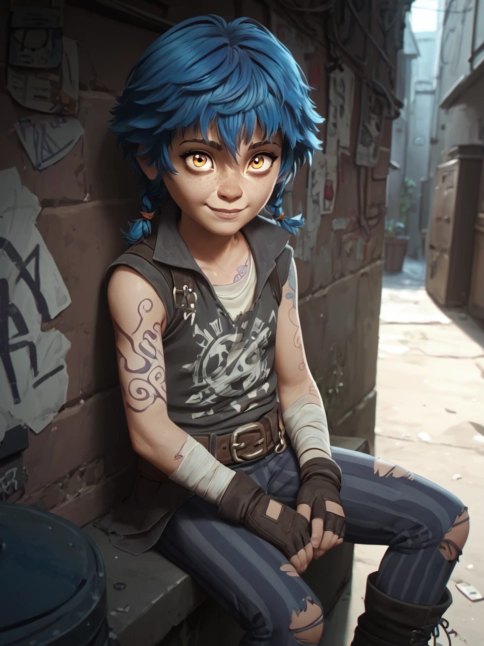 Ish4, 1girl, solo, short hair, bangs, gloves, blue hair, braid, pants, orange eyes, fingerless gloves, torn clothes, tattoo, bandages, child, freckles, brown belt, striped pants, brown footwear