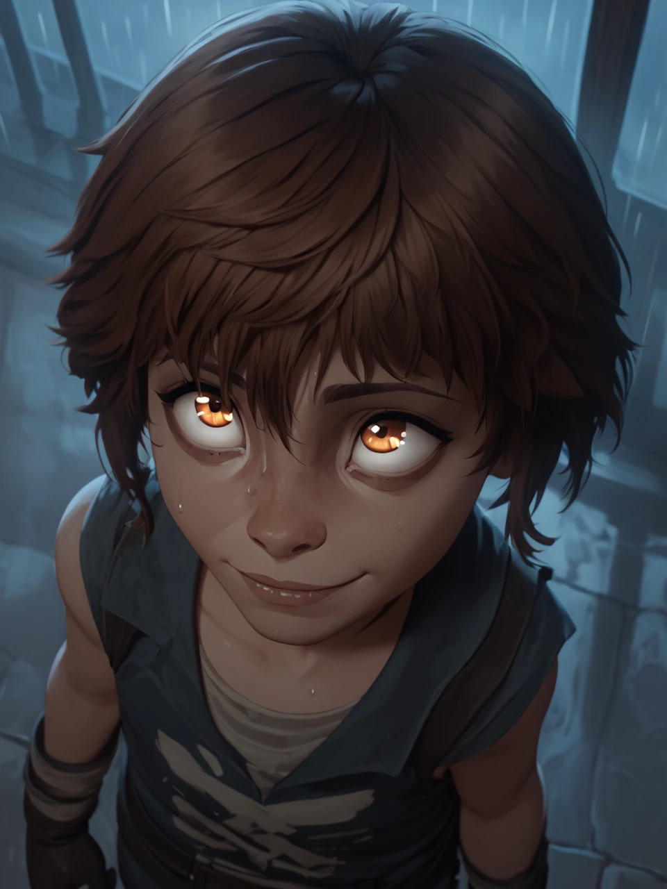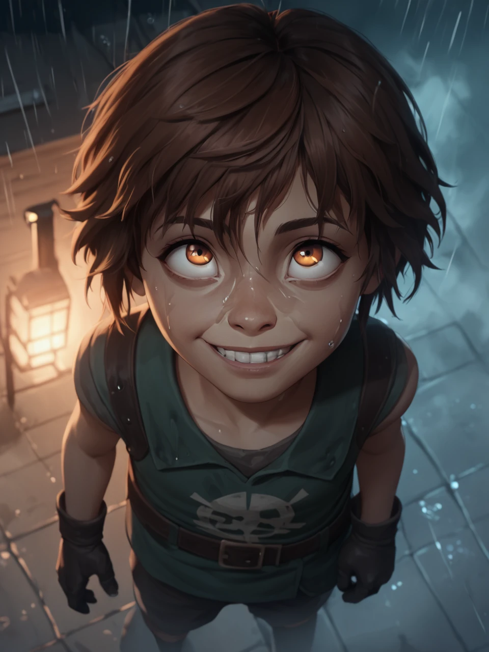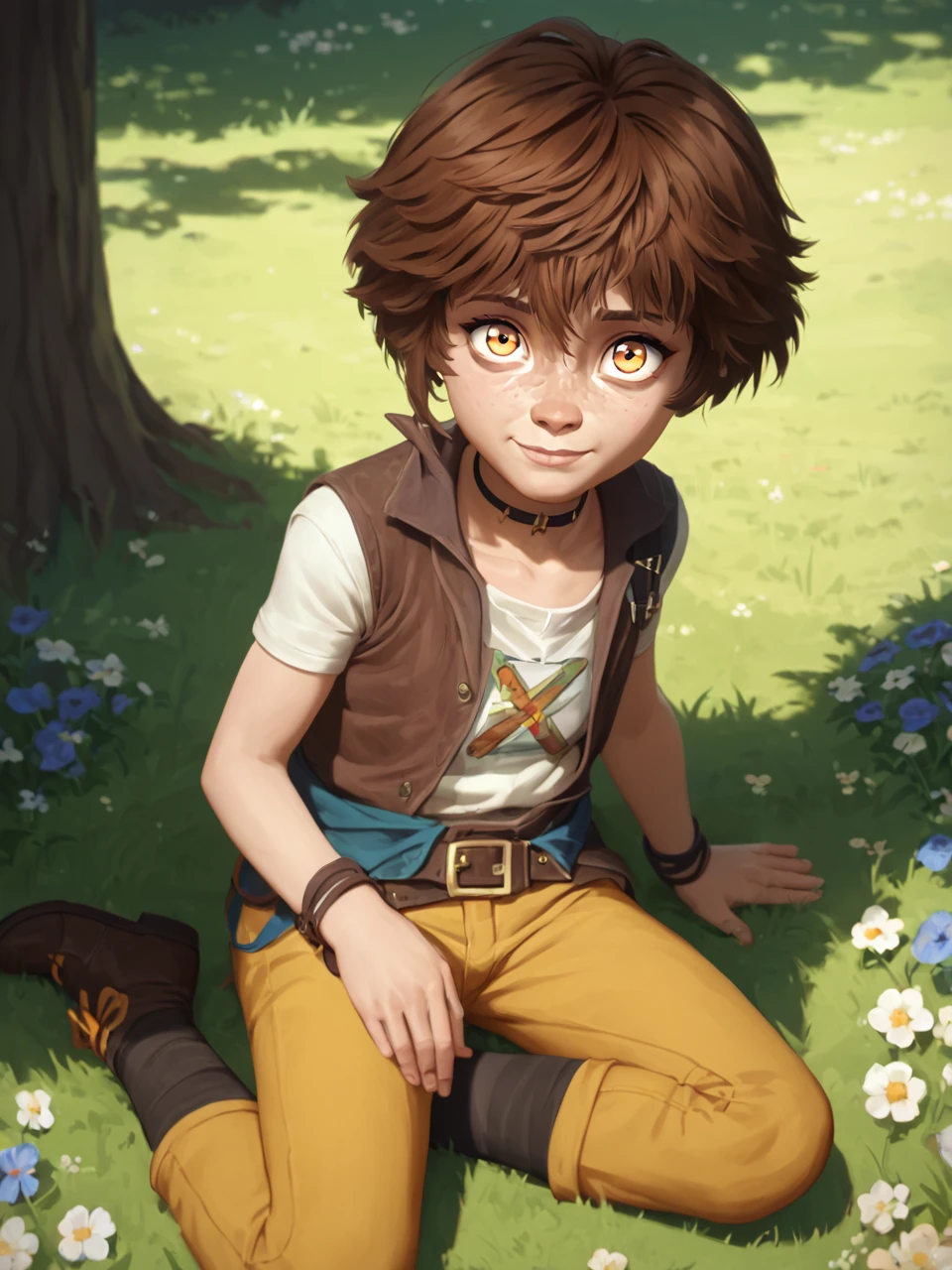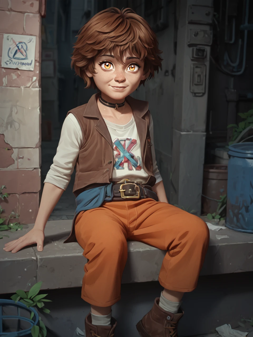 Ish4, 1girl, solo, short hair, brown hair, white shirt, brown vest, belt, child, yellow pants, orange eyes, freckles, black choker, brown footwear,