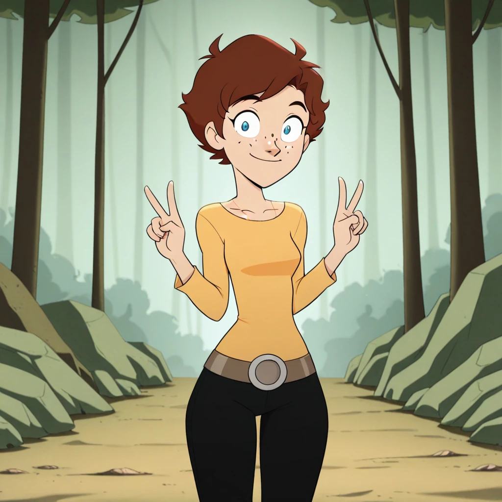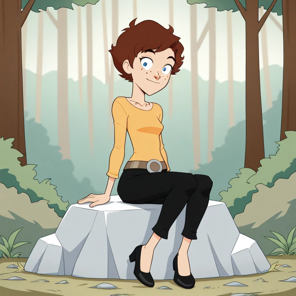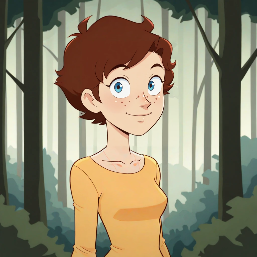 HenriettaSmufton, 1girl, solo, brown hair, short hair, blue eyes, freckles,