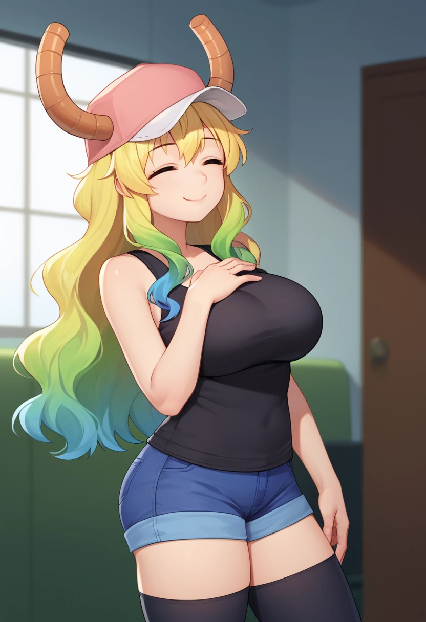 Default Outfit: pink headwear, horns through headwear, baseball cap, black tank top, blue shorts, denim shorts, short shorts, black thighhighs, bare shoulders
