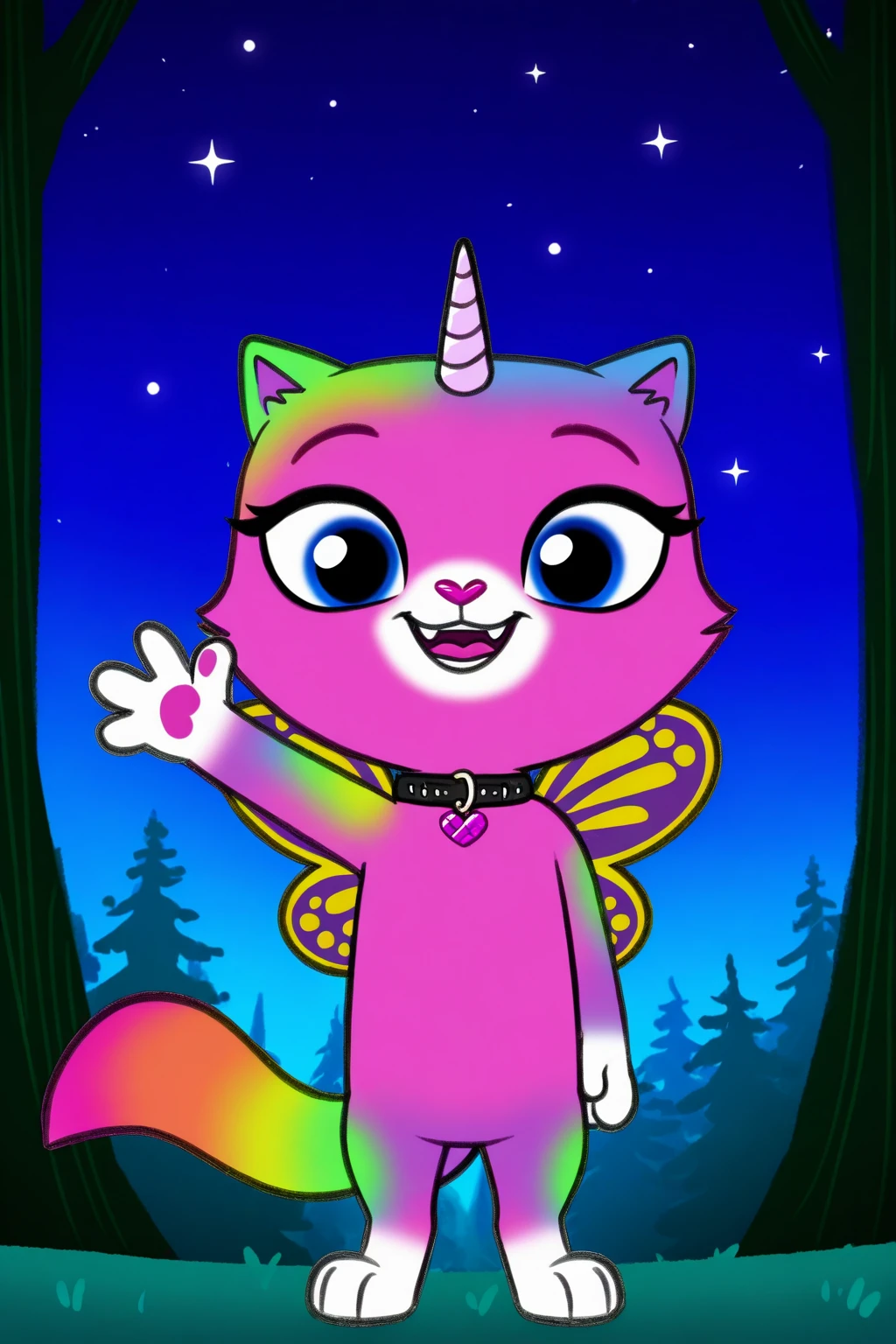 Helpful: 1girl, anthro, feline, unicorn horn, rainbow fur, butterfly wings, rainbow tail, collar, heart-shaped tag