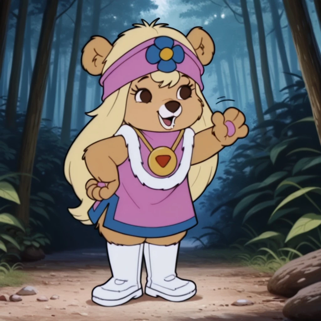 PrncssPawPawil, semi-anthro, female, bear_girl, tan fur, black eyes, blonde hair, long hair, pink headband, gold amulet, pink poncho white fur trim, pink dress blue trim, white boots,