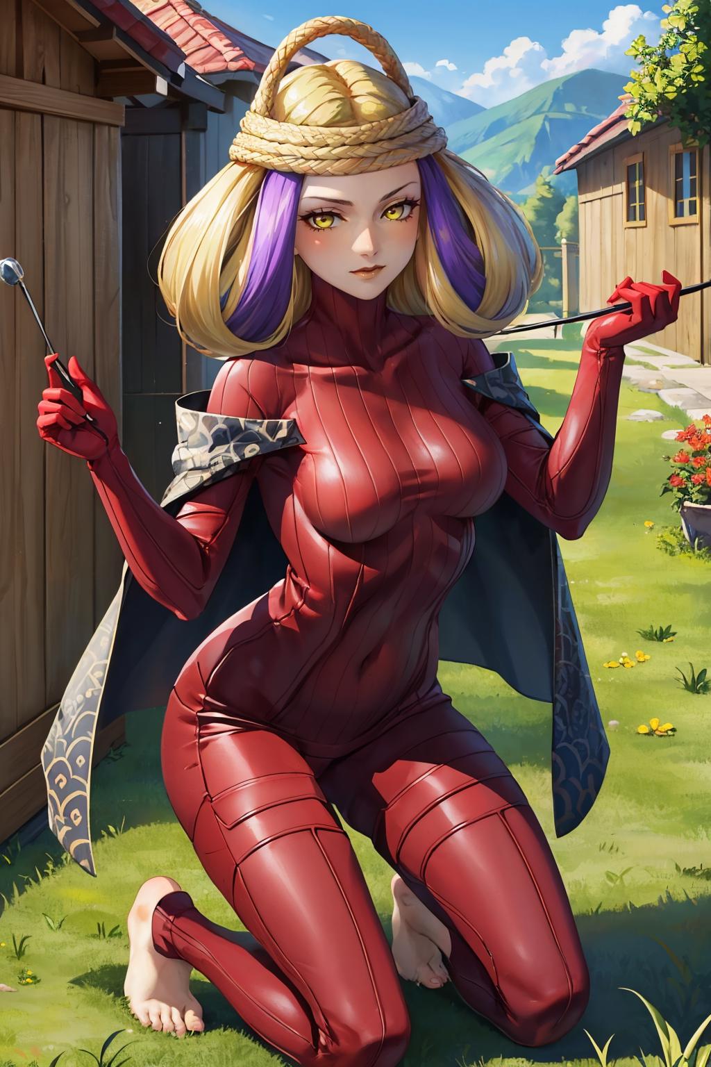 Tags: lachesissmt, multicolored hair, blonde hair, purple hair, bodysuit, yellow eyes, barefoot